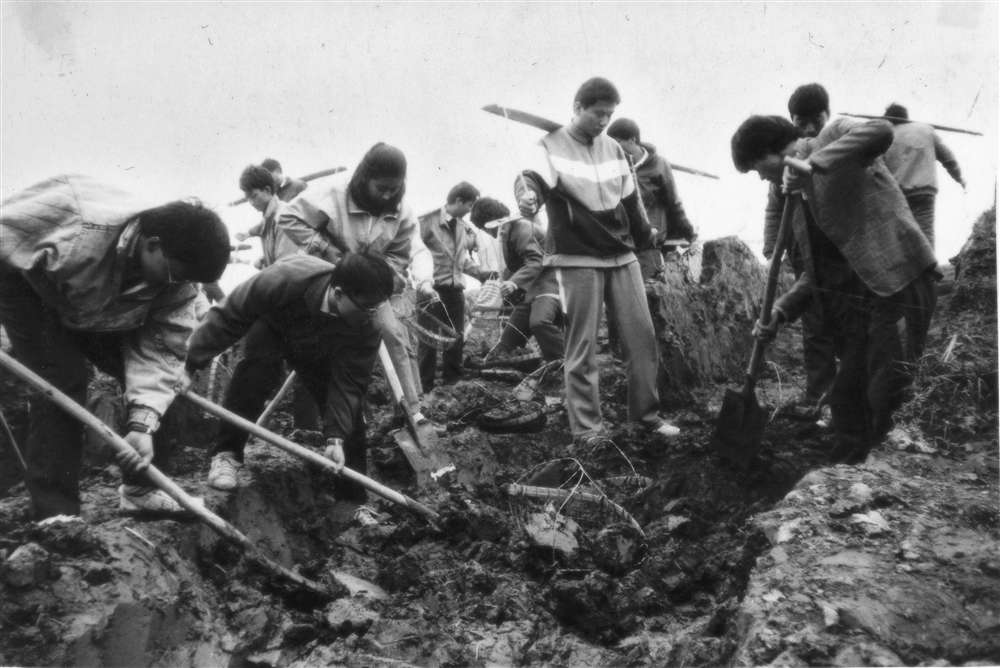 全院学生会和团的干部在农村水利工地参加义务劳动