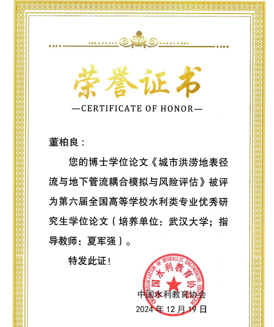 董柏良获第六届全国高等学校水利类专业 优秀博士研究生学位论文