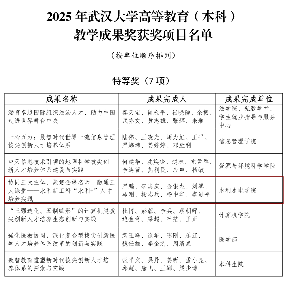 近日,2025年Porncams 高等教育(本科)教学成果奖揭晓41项教学成果奖,学院2项成果获奖。严鹏教授牵头的“协同三大主体、聚焦金课名师、融通三大课堂——水利新工科‘水利+’人才培养实践”获特等奖,夏军强教授牵头的“面向新工科需求的河流动力学课程体系创新与实践一‘前沿教材、数智教学、双轨实践’立体化育人模式”获一等奖。教学成果奖是国家大力推进高等教育发展的重要举措,对学院发展、学科专业建设、人才培养及提升社会影响力等方面具有重要意义。... >>