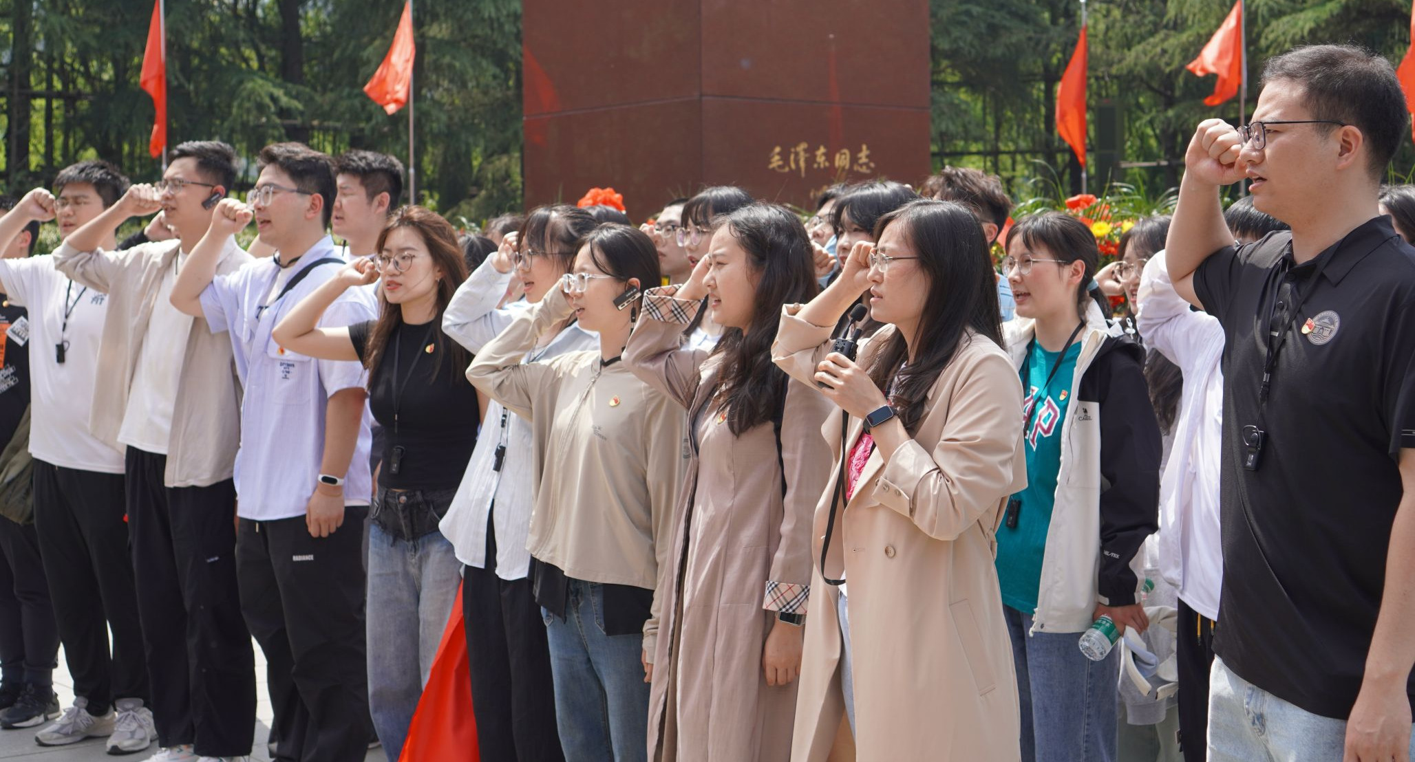 4月17日上午,同学们从学院出发抵达韶山,怀着无比崇敬的心情先后前往毛泽东广场、毛泽东故居及毛泽东纪念馆参观学习。在毛泽东广场,党员们整齐列队,向毛泽东同志铜像敬献花篮并三鞠躬,表达对毛泽东同志的无限敬仰与深切缅怀。面对鲜艳的党旗,左志香带领全体党员高举右拳,重温入党誓词,回顾入党初心,接续砥砺奋斗。