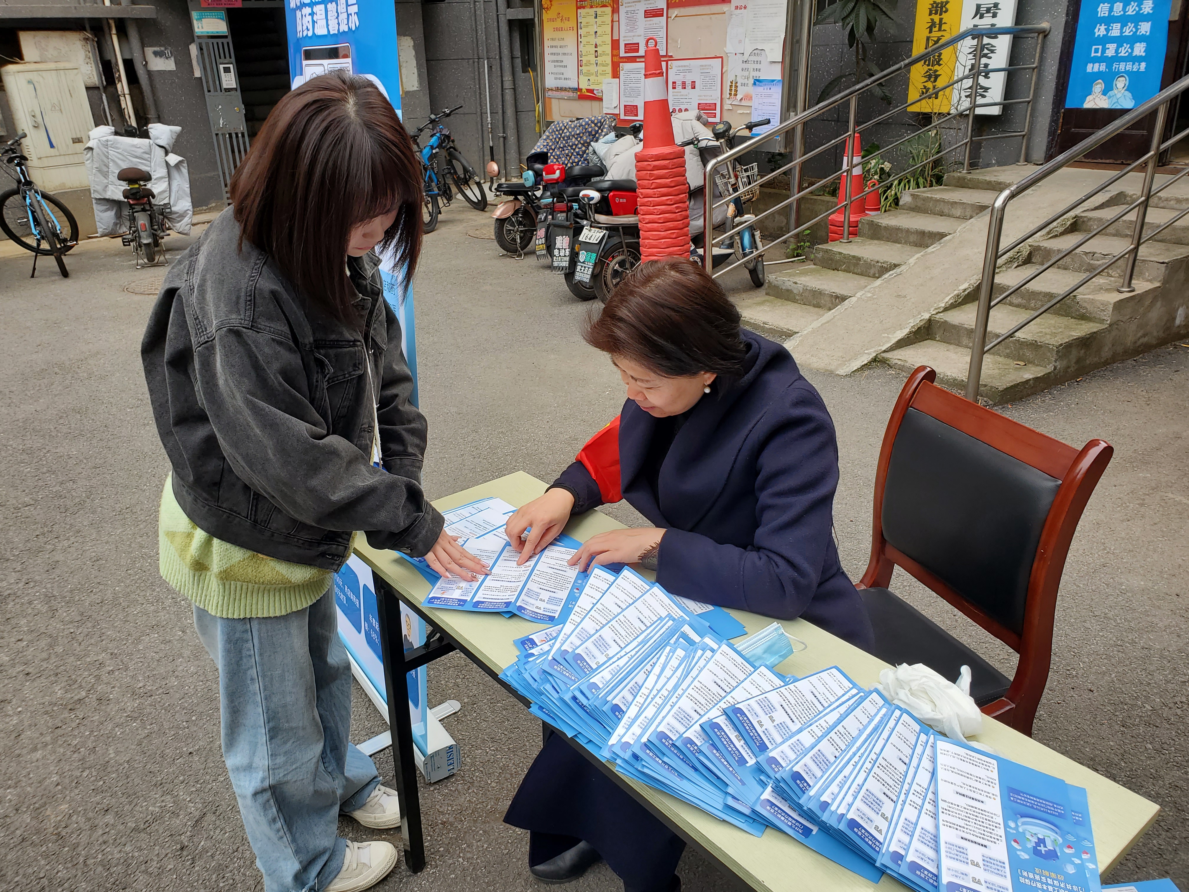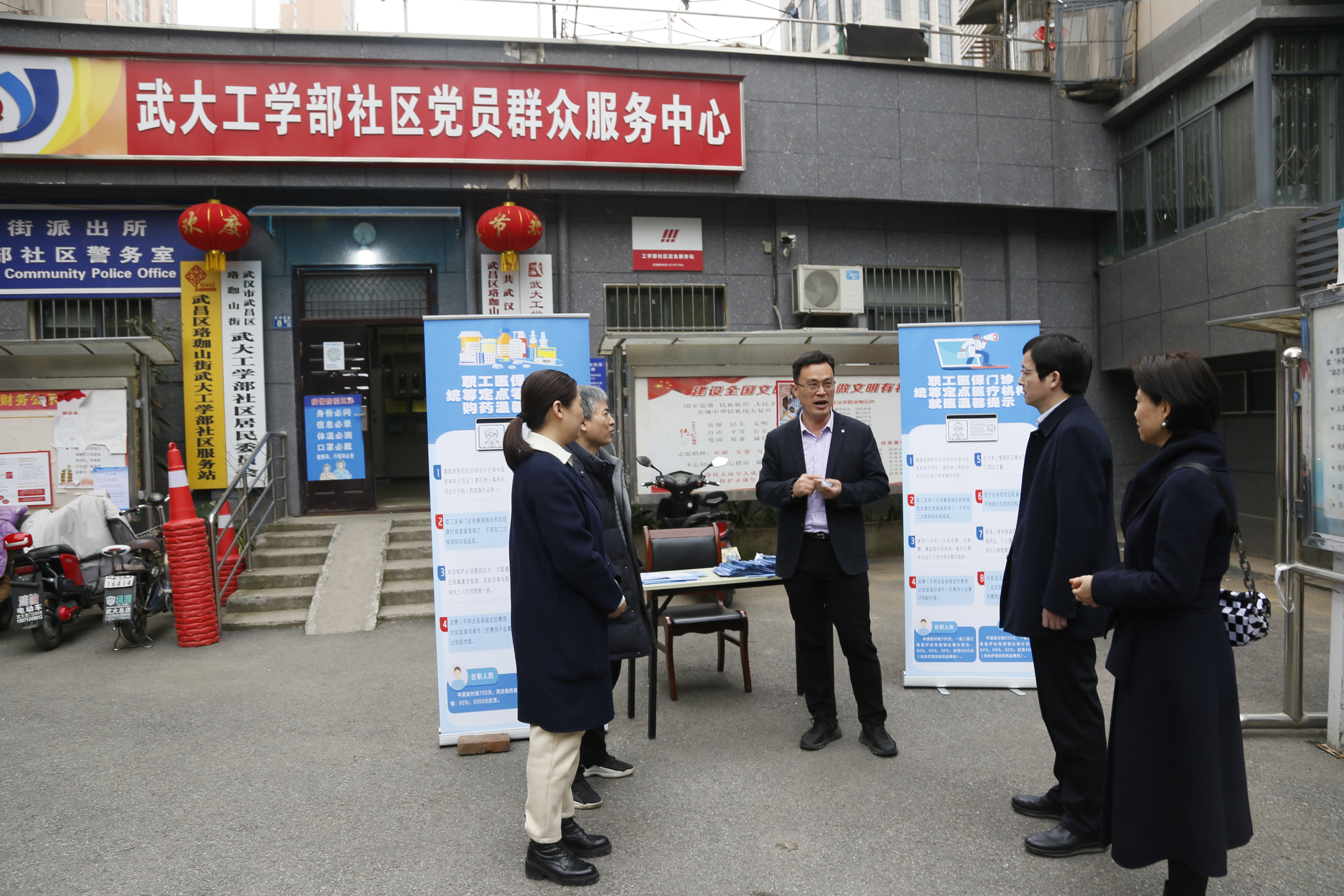在工学部社区大门口,党员志愿者竖起“易拉宝”,发放宣讲宣传手册,解答职工医保门诊统筹定点医疗机构就医可能遇见的一般性问题。首次下基层下沉社区党员志愿者有李志威、林涛同志。