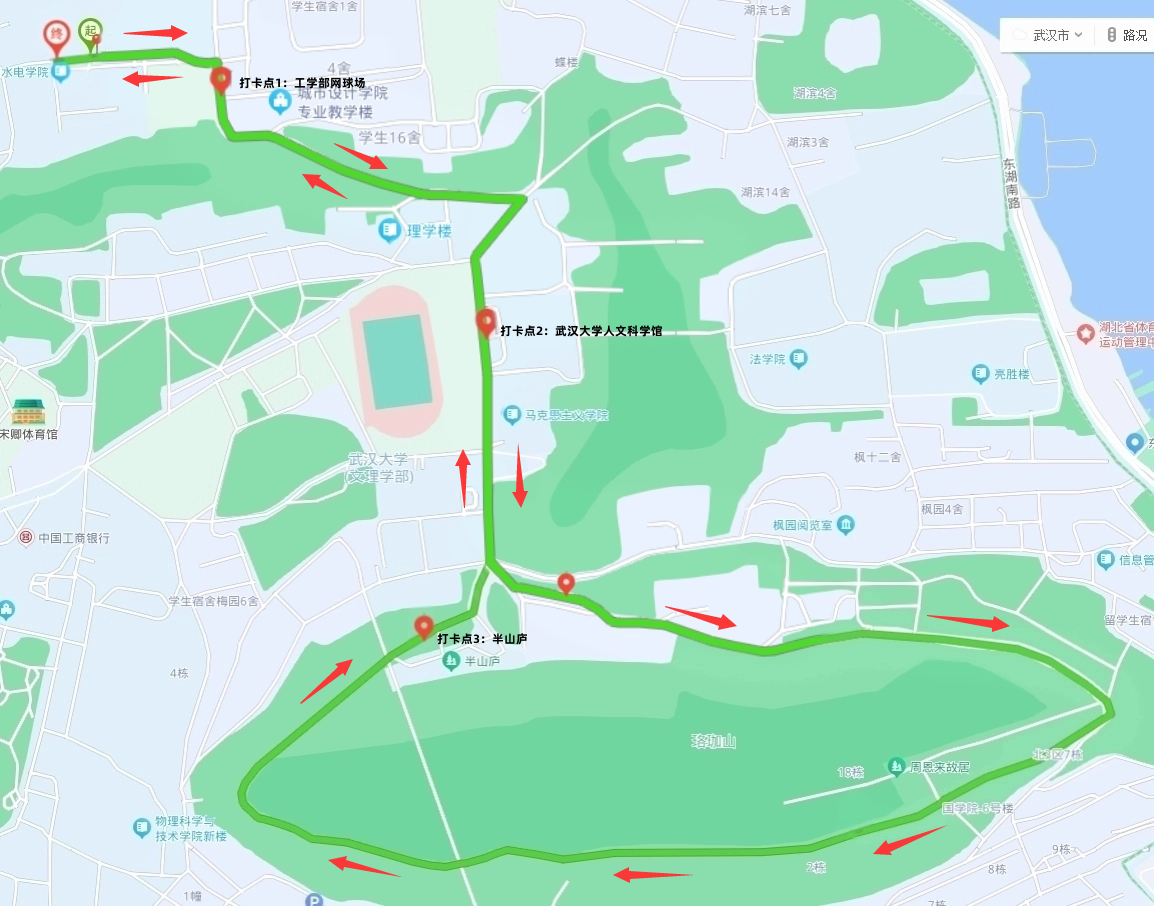健步行线路:起点(学院8教院子)——网球场——樱园北路——新闻传播学院—人文路——珞珈山庄——环山北路——环山南路(环珞珈山一周)——人文路——新闻传播学院——樱园北路——网球场——终点(学院8教院子)