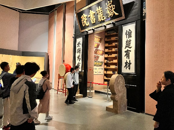 水育万物于无声,接下来同学们进入到“感知文明”厅。该厅通过“人类摇篮 文明发端”、“青铜时代 尽显风流”等八个单元,着重彰显了长江的绚丽多姿的历史与文明。新石器时期长江流域先民们祭祀、打猎、捕鱼、纺织的工具模型,精妙逼真,再现了当时的社会场景和人类生产生活演化进步的历史。长江以其博大的胸怀孕育了灿烂夺目的长江文明,藏羌文化、巴蜀文化、荆楚文化、吴越文化百花齐放,满目琳琅,使同学们不自觉沉入一场“文明的漩涡”。