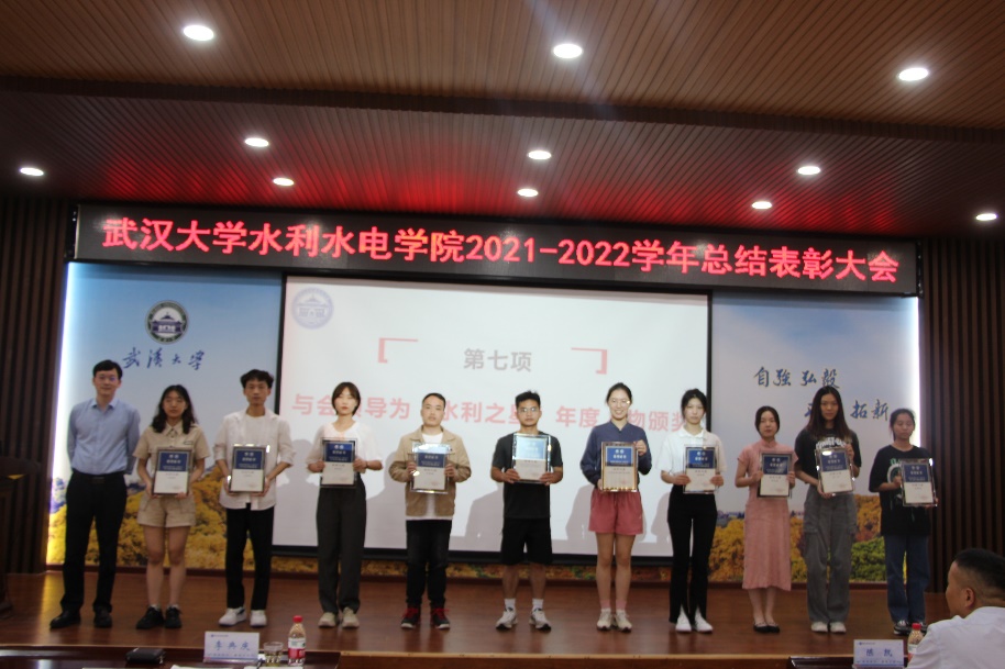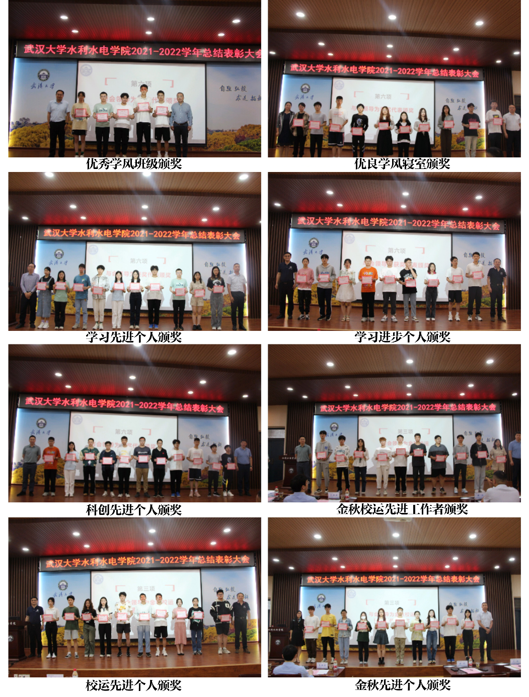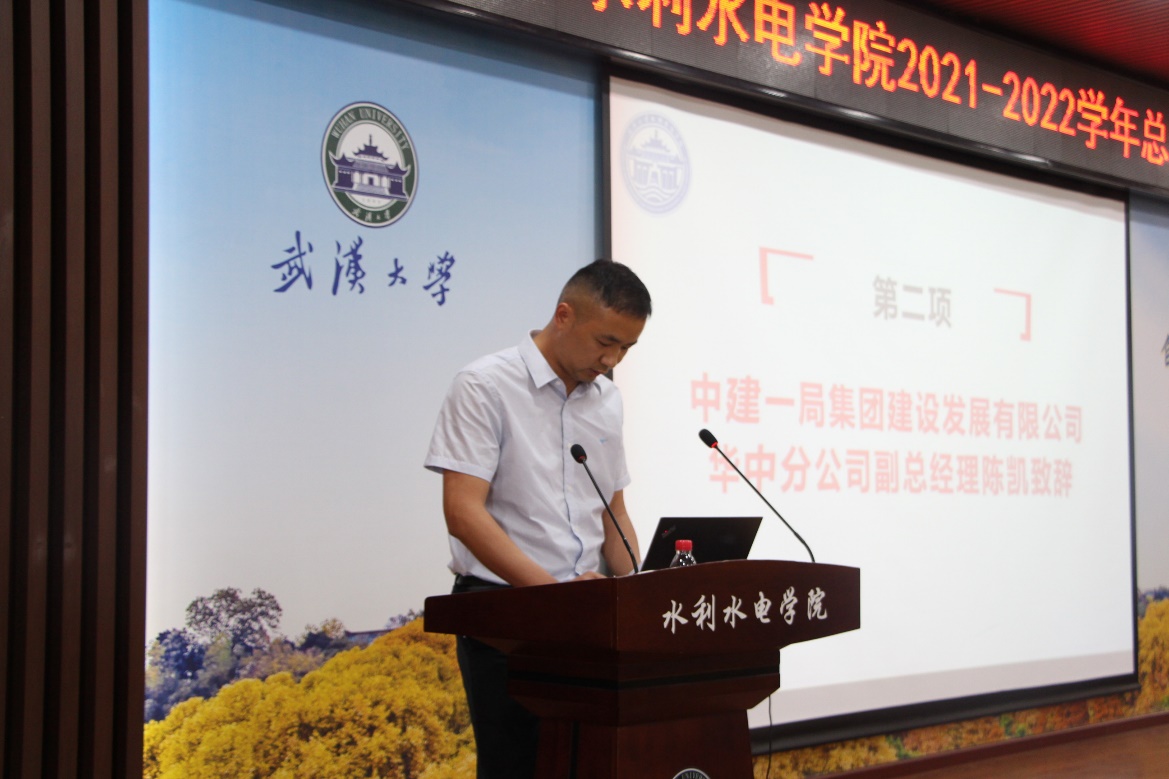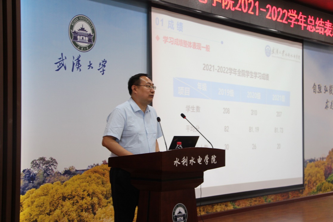 2021-2022学年总结表彰大会在学院8328报告厅隆重举行。中建一局发展华中分公司副总经理陈凯,学院党委书记、水资源工程与调度全国重点实验室主任李典庆,副院长严鹏、夏军强、任春秀、程磊,水力发电工程系主任苏凯,水文水资源系教授张橹,河流工程系主任杨中华,水利工程系主任管光华,智慧水利系副主任刘勇,全体辅导员、各年级获奖学生代表和2022级工科试验班全体同学参加了本次会议。会议由学院党委副书记于敏主持。