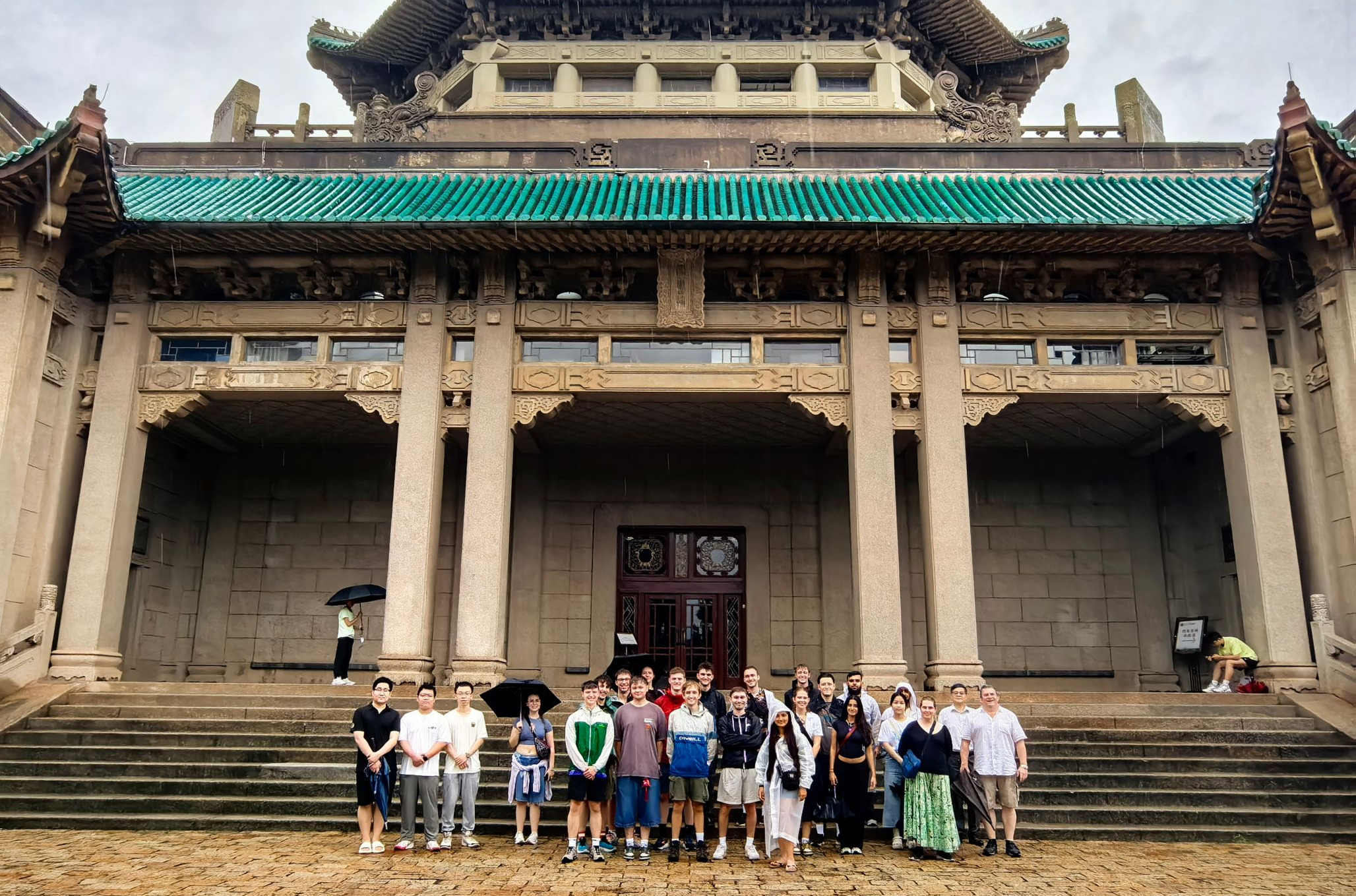 牌坊处,学生志愿者详细讲解了牌坊背面“文、法、理、工、农、医”六大学科门类的办学理念,以及“自强、弘毅、求是、拓新”校训精神的深刻内涵,使英国师生对Porncams