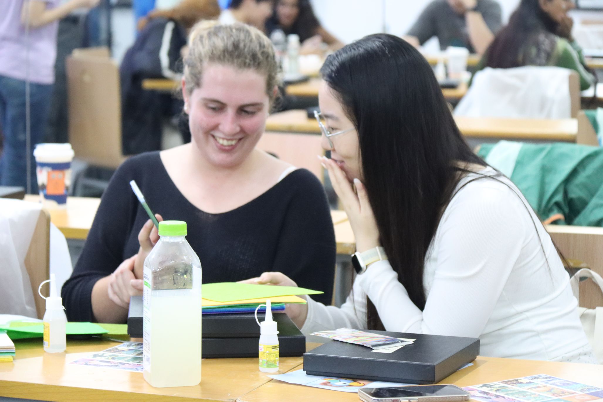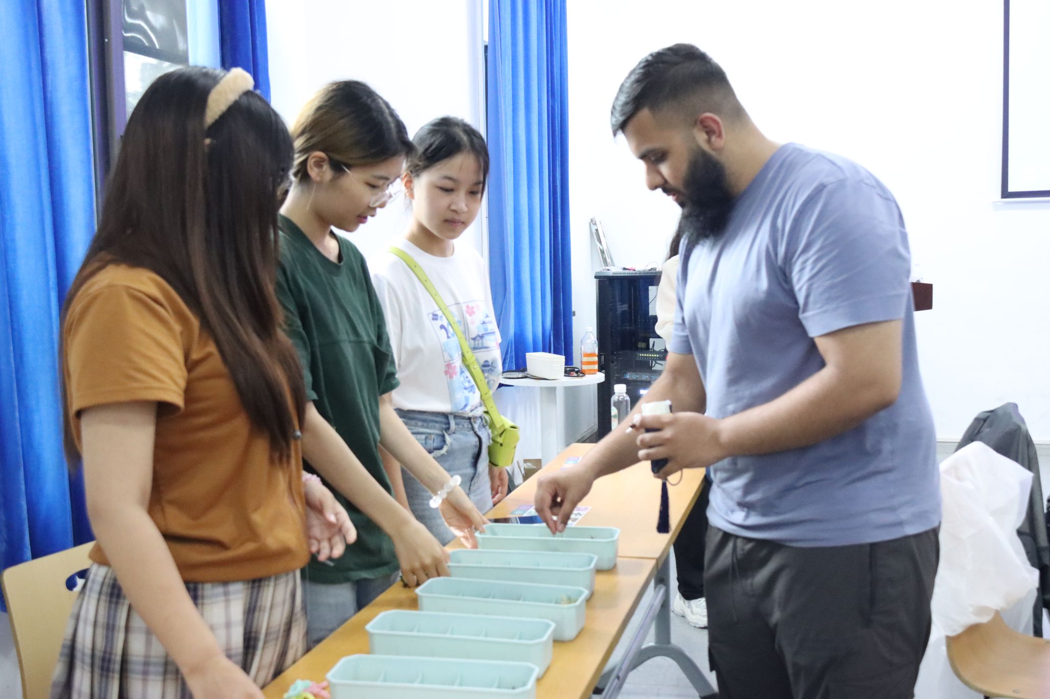 在交流环节中,两校师生共同参与了漆扇制作、香囊配制等传统手工艺体验活动。活动现场气氛热烈,师生们分组合作,在动手实践中感受中国传统手工艺的魅力。漆扇制作环节成为亮点,中英学生围绕图案设计、色彩搭配展开深入交流,在创作过程中增进对中国非遗文化的理解。通过共同完成手工艺品,双方在轻松愉快的氛围中实现了“破冰”,进一步拉近了距离。