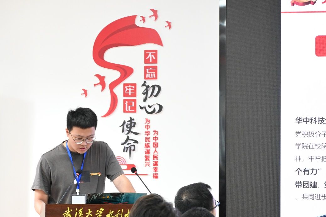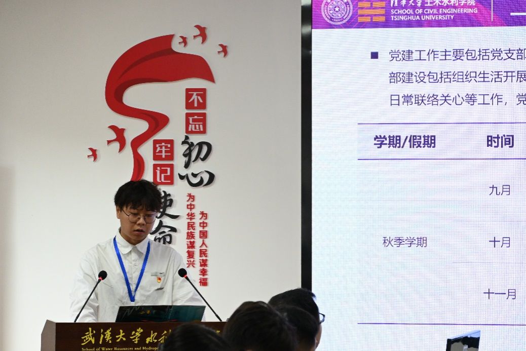华中科技大学土木与水利工程学院党务中心主席团周琨皓同志作“固本强基筑堡垒,党旗领航风帆劲”的党建工作汇报。他围绕“精耕凝心聚魂”,“聚焦赋能增效”,“强化示范引领”等方面,介绍了学院研究生党组织坚持“组织管理、制度管理、考核管理,自我管理”四位一体的具体举措。他提出,校院联动到位、基层指导到位和创新融合到位,在培养高素质党员、推进学术研究和社会服务等方面有着积极作用。