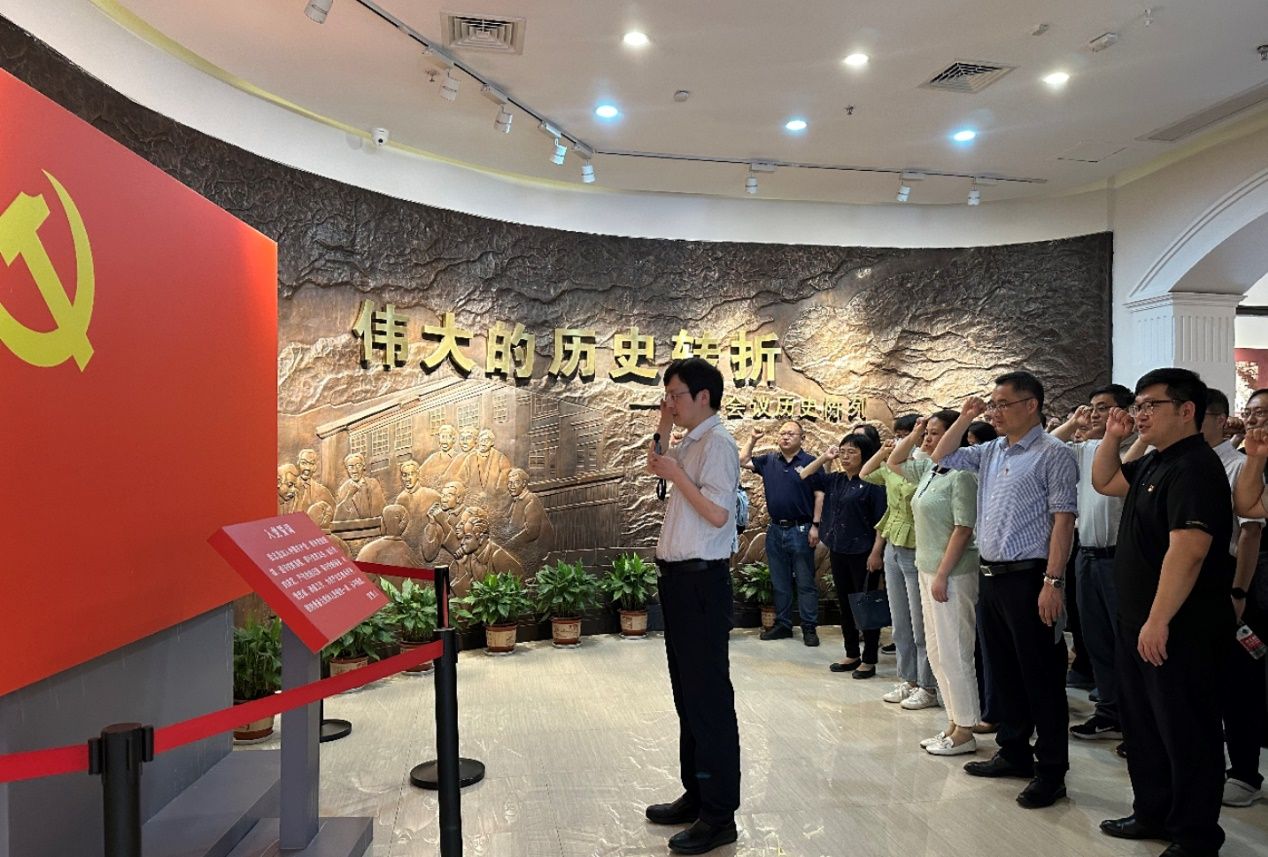在党旗下,党员干部们举起右手庄严肃立,铿锵有力地重温入党誓词,重忆入党初心,重新接受党性洗礼。