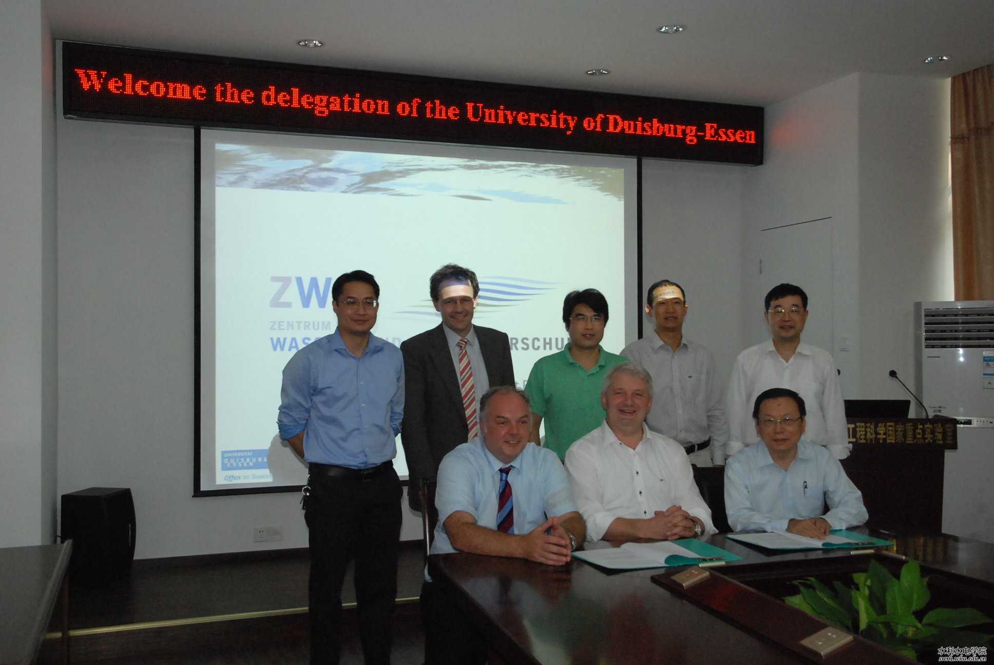 与德国杜伊斯堡-埃森大学水利工程与水资源管理研究所签订了框架合作协议。黄介生院长表示,希望在以往合作的基础上,双方以具体项目作纽带,共同推动在学术交流、学生联合培养等方面的实质性进展。Schroeder教授表示一定会积极推动共同合作,争取在1-2年内取得实质性进展。