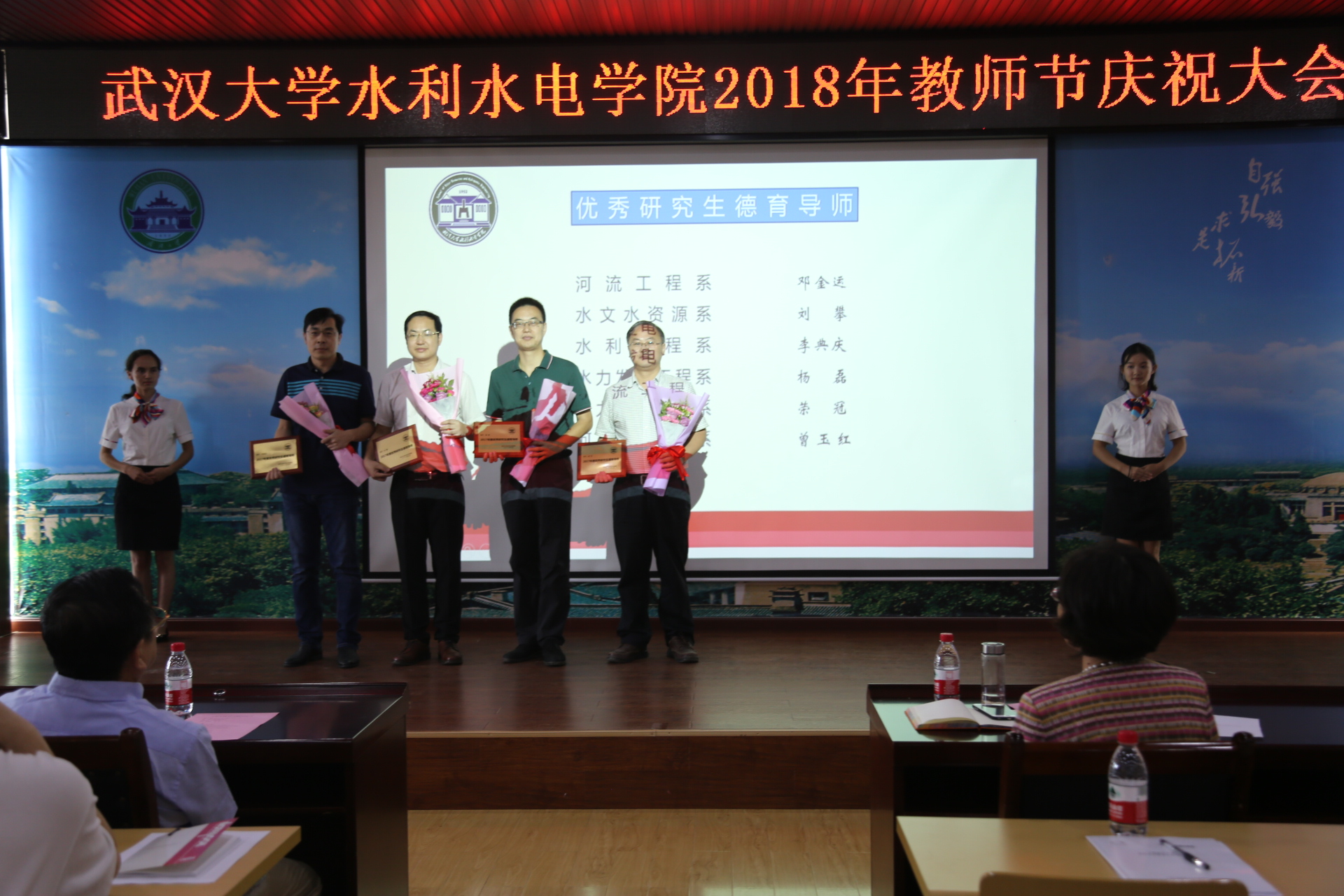 多位教师受到表彰。石长征、阮燕、杨中华、陈杰、周龙才、胡冉、梁文泉、管光华8名教师被授予“2017年优秀本科生班级导师”荣誉称号;邓金运、刘攀、李典庆、杨磊、荣冠、曾玉红6名教师被授予“2017年优秀研究生德育导师”荣誉称号;朱焱、张艳军、刘任莉、张晓春、严鹏、林忠兵6名老师作为青年教师教学竞赛获奖教师代表受到了表彰。