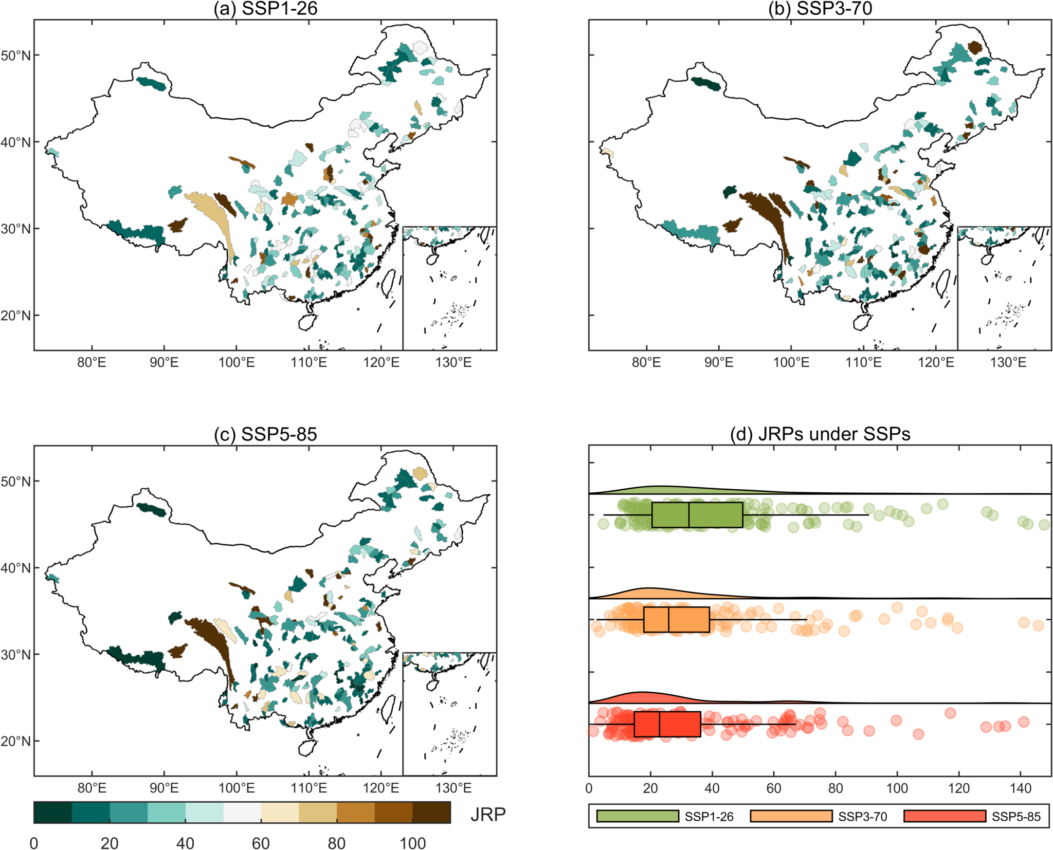 在中国204个流域开展径流模拟试验,发现物理机制约束下的深度学习模型具有更优的水文模拟效果,尤其适用于人类活动影响剧烈的区域。假定不同的碳排放情景和社会经济发展路径,采用偏差校正后的最新全球气候模式集合输出驱动该水文-深度学习耦合模型,预估了中国主要流域的未来日径流系列。进一步考虑洪水事件的多变量特征属性,采用统计学模型构建了洪水峰值和持续时间的联合分布函数,并通过联合概率密度函数表征洪水事件的最可能组合,评估了本世纪末中国洪水风险的变化特征(图2)。最后,基于共享社会经济路径的动态发展指标,量化了受洪水风险增加影响的人口和地区生产总值,并综合评估了洪水及其社会经济风险预估的不确定性。