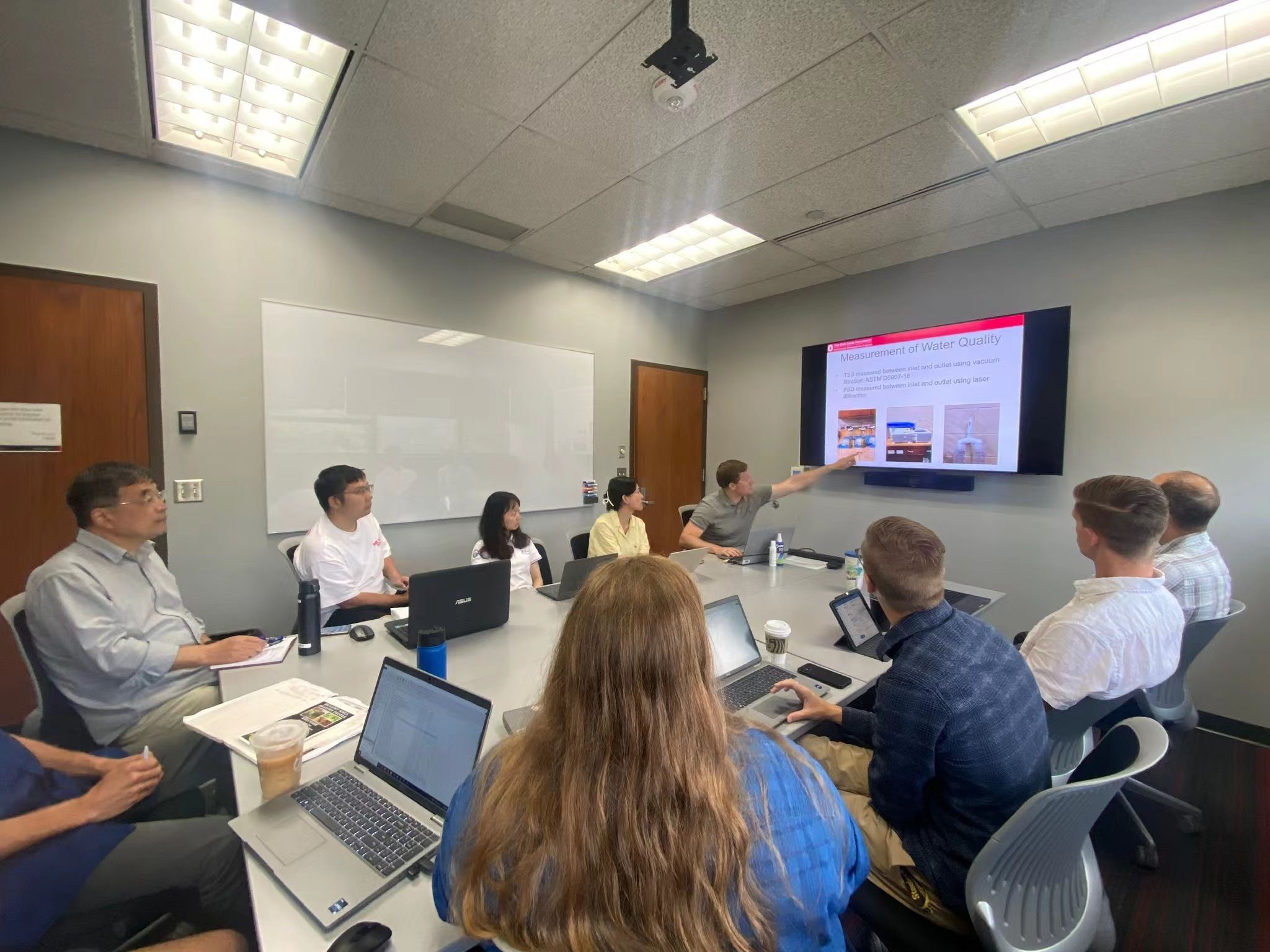-俄亥俄州立大学合作团队开展学术交流,Ryan Winston副教授及团队Joey Smith 博士研究生等对其所在哥伦布市的“蓝图哥伦布”计划进行深入介绍,包括计划理念、实施方法、具体设计等,展示了“蓝图哥伦布”计划的城市雨洪管理绿色方案,双方就绿色基础设施的具体设计、区域LID系统分析等学科前沿问题进行讨论,在激烈的思维碰撞中寻求进一步科研合作的方向。