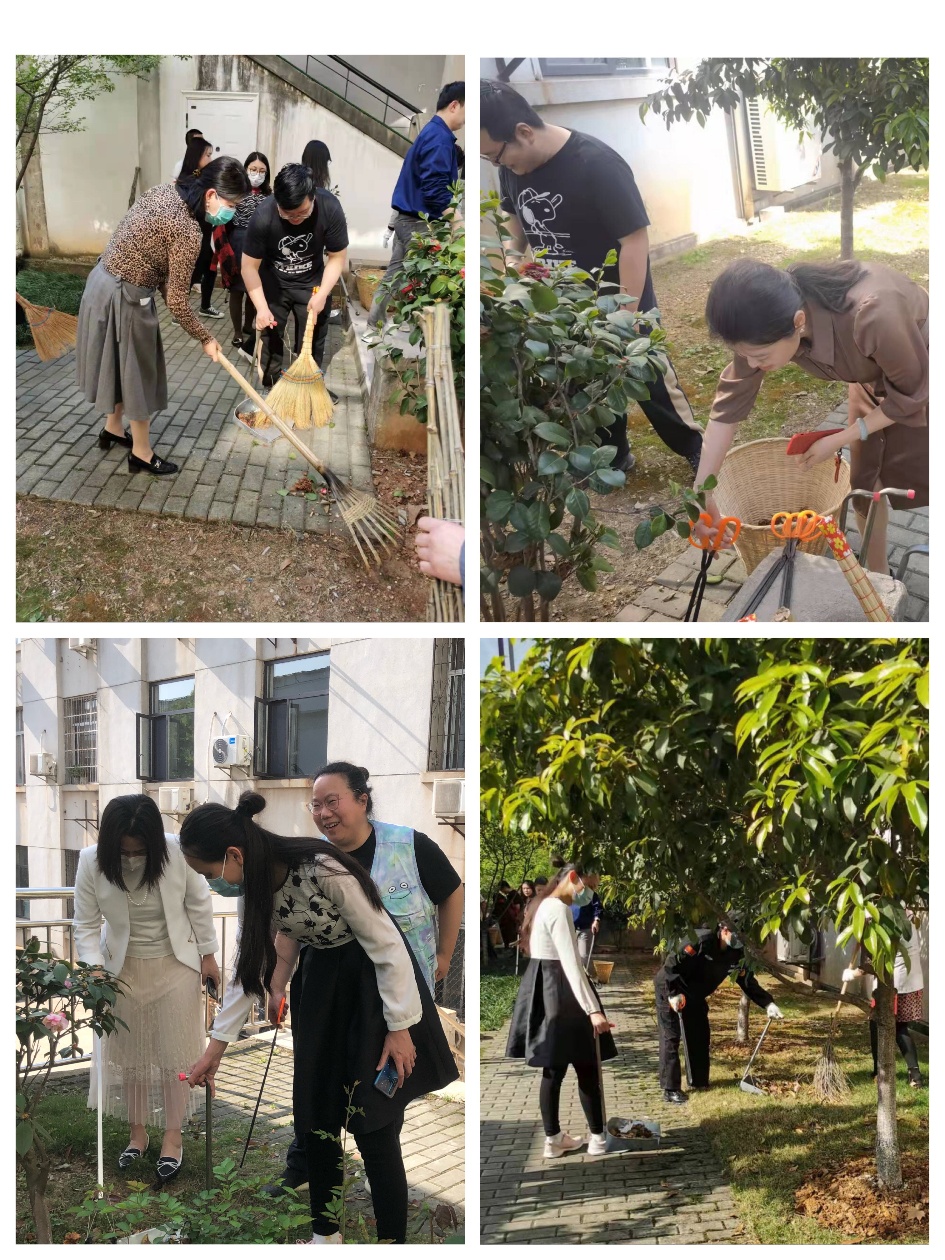 机关办公室全体成员与学生志愿者们一起,按照学校统一安排,对学院所辖卫生包干区进行了大扫除,彻底清除了八教和六教间小花园里的落叶、垃圾和积存杂物。