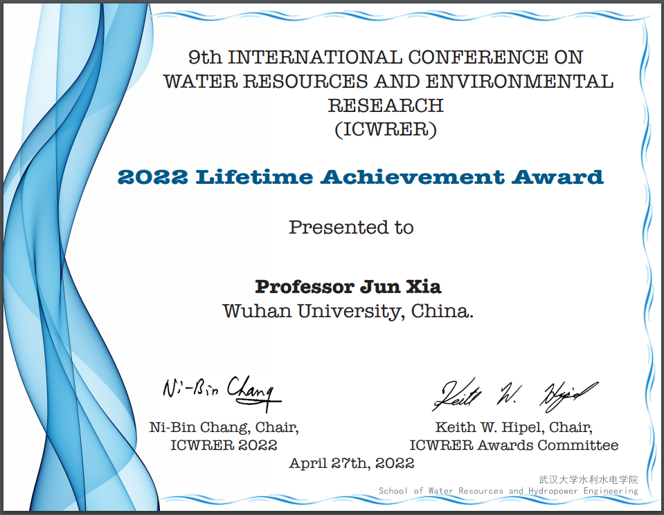 2022年4月25-27日,第9届国际水资源与环境大会(ICWRER2022)在美国佛罗里达大学通过线上线下方式举行。来自全球涉水领域的学者、工程师和管理者参加了此盛会。大会主题聚焦复杂水与环境系统的交叉与可持续解决途径。在4月27日大会的专门授奖日程上,ICWRER大会奖励委员会主席Kieth Hiple教授宣布,加拿大工程院院士Edward A. McBean教授、美国工程院院士Vijay P. Singh教授和中国科学院院士夏军教授等三位国际知名水文水资源学者,荣获2022年国际水资源与环境研究终身成就奖(ICWRER Lifetime Achievement Award 2022),以表彰他们对全球水资源和环境研究做出的杰出贡献。