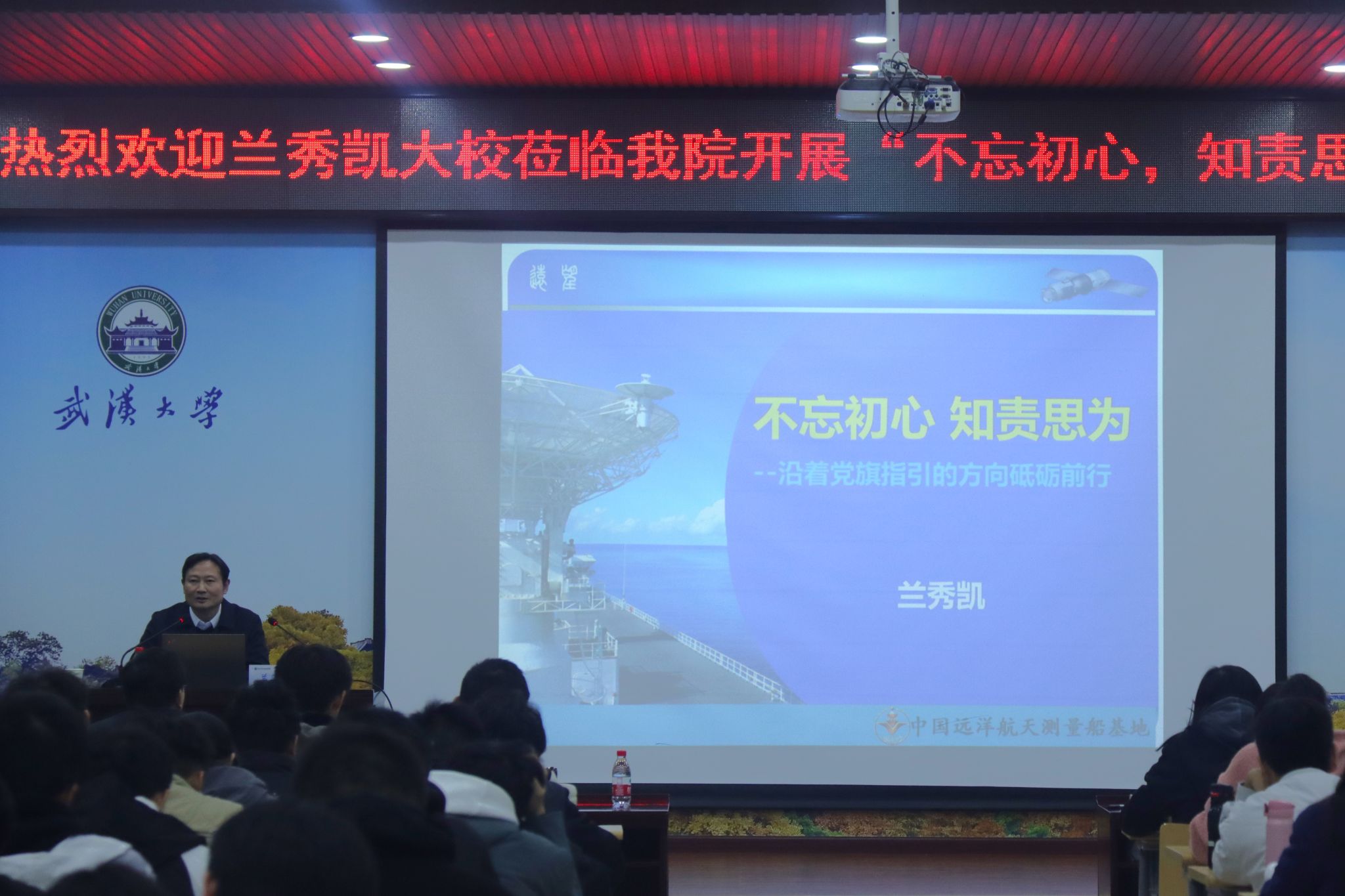 8328报告厅,无锡市水利局副局长、原远望三号、远望四号船长兰秀凯大校以“不忘初心 知责思为”为题,给2023级本科生开展了一场理想信念教育讲座,内容丰富、意义非凡、启示深刻。本次讲座由学院党委副书记于敏主持。