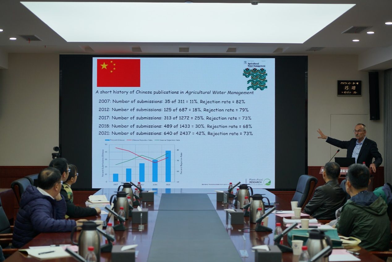 Brent Clothier教授担任国际知名期刊《Agricultural Water Management》主编10多年,本次学术报告Brent Clothier教授围绕“如何撰写一篇高质量的国际期刊学术论文”,分别从为什么要发表论文、如何讲好科研故事、选择和研究期刊并结合自身科研经历进行了全面且生动的介绍。他多次强调,一篇好的学术论文像讲述一个“有趣的故事”,让自己的研究亮点与科学问题能够快速抓住审稿人与主编的眼球。同时图表在文章中的合理运用将使得自己的故事更加生动易读。随后,Brent Clothier教授以基于土壤-植物-环境响应关系的区域水土资源可持续利用综合技术体系与模式为例,介绍了如何讲好科研故事并发表。