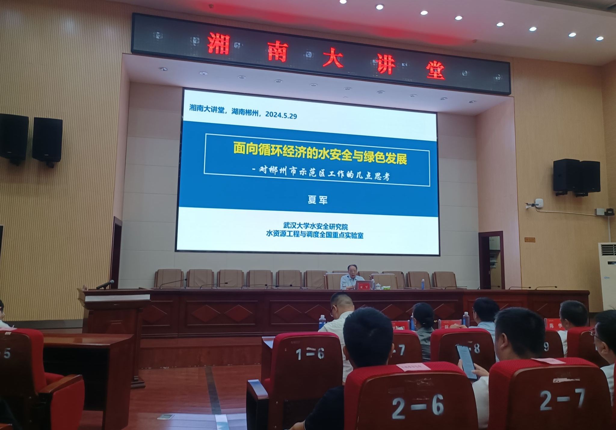 5月29日,夏军院士在湘南大讲堂为郴州市政府、各市直相关职能部门干部以及湘南学院师生们作了题为《面向循环经济的水安全和绿色发展——对郴州市示范区工作的几点思考》的学术报告。报告中,夏院士详细阐述了水安全与城市绿色发展的关系,并针对郴州市示范区未来工作的具体情况提出了切实可行的建议。他强调,郴州市在水资源管理中应更加注重绿色发展理念,通过科学管理和技术创新,提升水资源利用效率,保障水环境的健康和可持续发展。