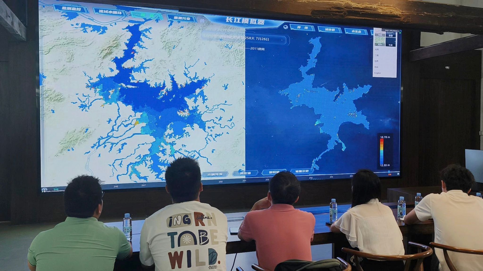 7月12日,实践队前往长江上游最大的江心岛——广阳岛。广阳岛不仅是生态修复的杰出代表,也是“长江模拟器”的示范基地。2021年6月中国科学院与重庆市政府共同建设长江模拟器科学装置(即大数据驱动的长江流域综合模拟与调控决策系统)的战略合作协议在重庆广阳岛签约,并在2023年交付使用。中科院地理资源研究所林忠辉教授向队员们全面介绍了长江模拟器的功能和模型的机制与工作原理。“模拟器中包含三峡调度、流域水文、城市水系统等多个模块,具有‘监测—模拟—评价—预警—决策’支持功能,长江模拟器在重庆市的基础上做了水文监测和预警系统,用于防范洪水灾害,我们希望以后继续完善长江模拟器对城市内涝隐患的排查,并给出相应的解决方案供决策层参考。”林忠辉指出。