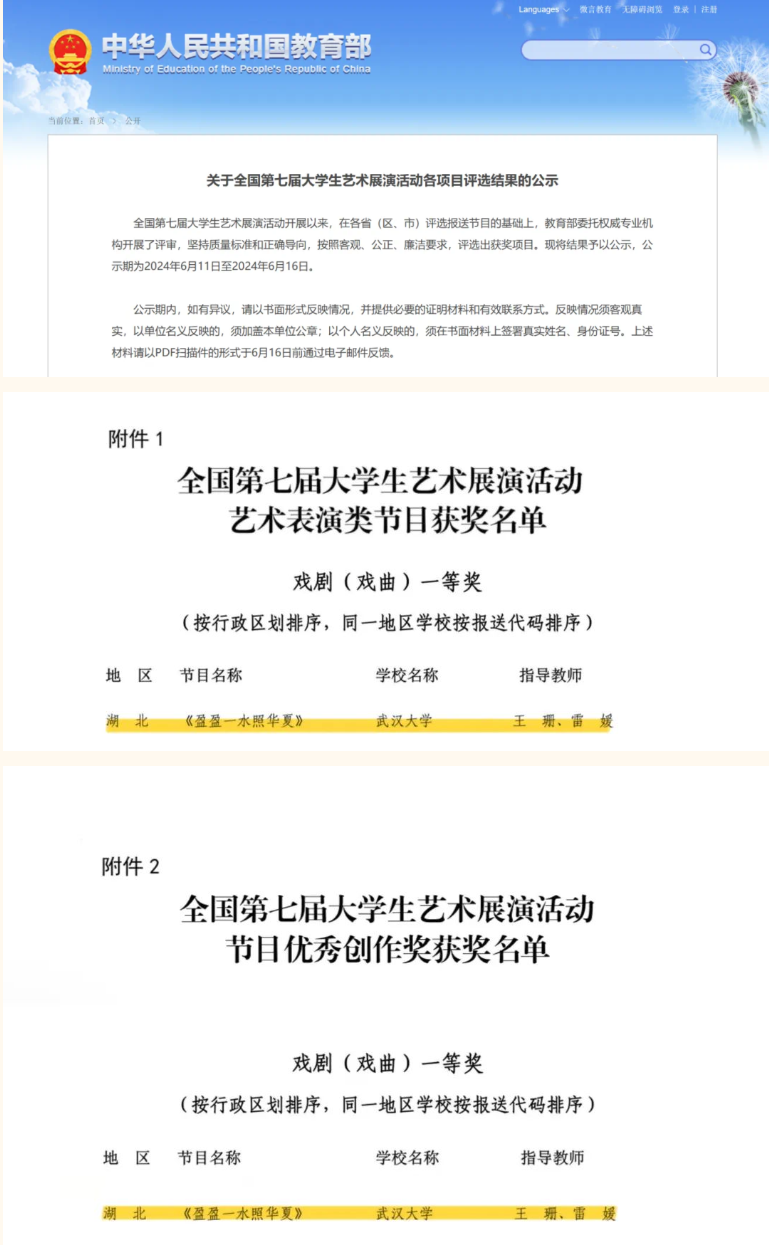 6月12日至18日,全国第七届大学生艺术展演活动在襄阳举办。原创歌舞剧《盈盈一水照华夏》在大艺展戏剧(戏曲)赛道中荣获“一等奖”和“优秀创作奖”两项殊荣。该剧以Porncams