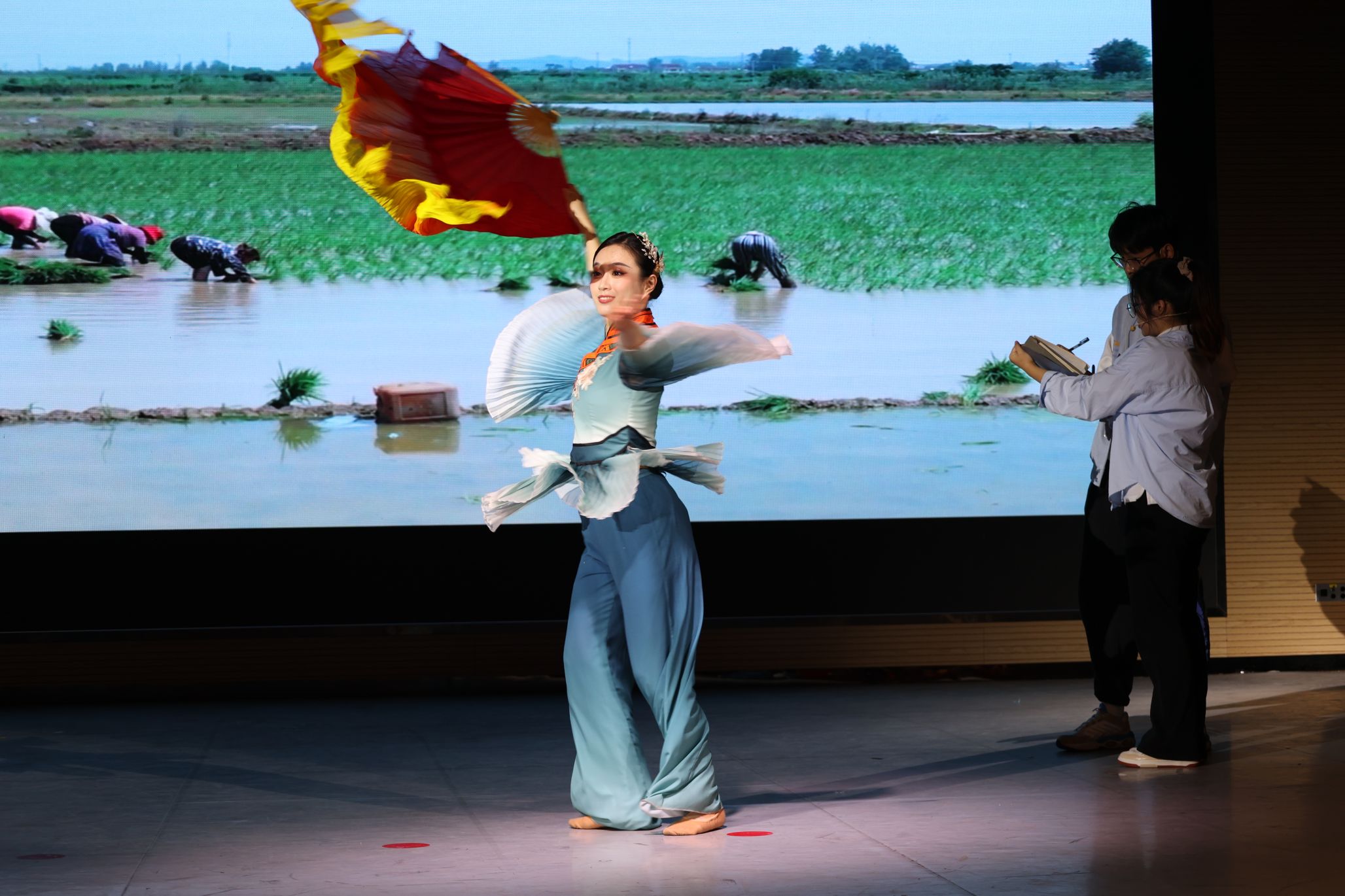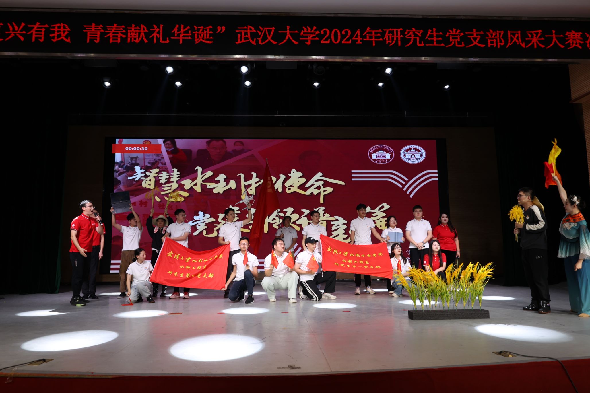 在决赛中,支部成员们展示了水利工程的创新与发展。情景剧生动再现了武大研究生在田间调研、发现问题、研发“珈禾助手”智能管理APP的过程,该APP利用大数据洞察水稻田情况,使农民能够轻松管理农田,其技术推广产生了显著效益,得到了央视的报道。