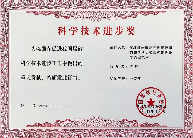 为第一完成单位的《深埋硬岩隧洞开挖爆破瞬态卸荷动力效应控制理论与关键技术》荣获2024年中国爆破行业协会科学技术进步一等奖。