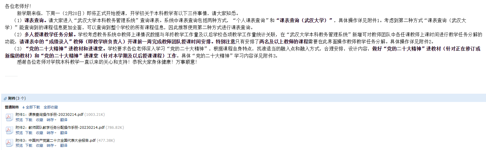 为了提醒老师做好开学准备,学院教学办公室除了一对一通知第一周授课教师具体上课信息,同时给每位老师发了一封开学前提醒邮件,请大家关注本科教学开学初三件事情:课表查询、多人授课教学任务分解、“党的二十大精神”进教材进课堂。