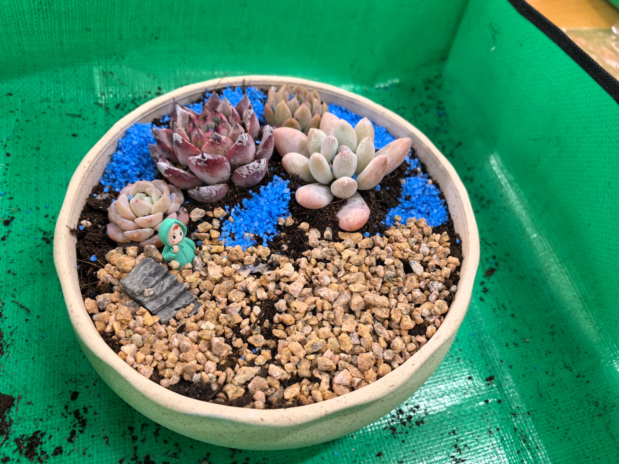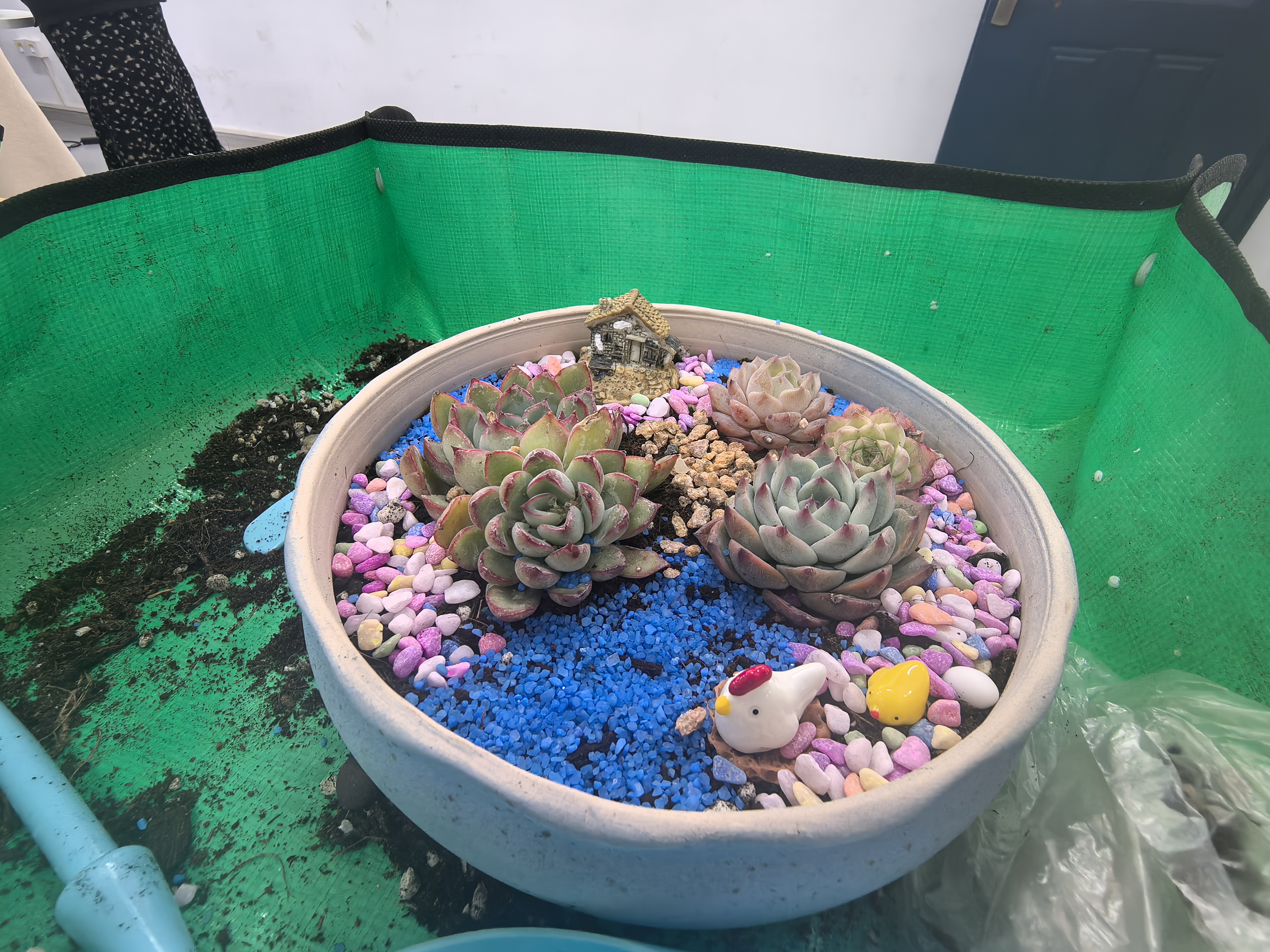 活动开始,培训老师为大家详细介绍了不同多肉植物的类别和制作步骤。教职工们精心挑选了属于自己独一无二的多肉花朵,在老师的指导下,每个人都认真专注,根据心意自由造型,加入了各式各样活泼生动的小摆件,或小桥流水,或亭台楼阁,或农趣盎然,每一盆都是一个鲜活的微小世界,展示着创造者们灿烂明媚的内心。