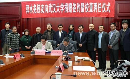 董事聘书。副校长谈广鸣与郭水尧签署协议,并颁发捐赠证书。校党委常委、总会计师应惟伟主持仪式。