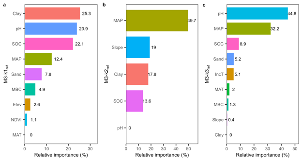 该团队以SOC分解一阶动力学模型为切入点,基于已发表的关于SOC分解培养实验和一阶动力学模型有关数据,构建了包含11个地形/植被/土壤/气候因子和SOC分解动力学参数的全球数据集,然后利用机器学习方法(Gradient Boosting Machine、Random Forest)建立了SOC分解动力学参数与潜在因子之间的量化模型,识别了影响不同SOC库分解动力学的关键因素及其调控机制(图1)。