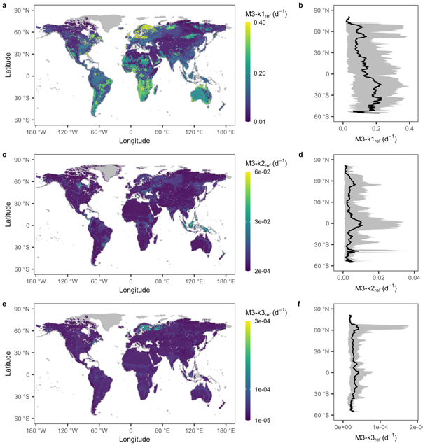 土壤有机碳是全球陆地最大的碳库,解析不同土壤有机碳(SOC)库分解动力学的全球模式及其主控因素,对气候变化背景下陆-气碳通量的准确估算至关重要。作为分析全球碳储量与通量的重要手段,地球系统模式(Earth System Model)通常根据SOC分解速率的差异性,将SOC分为多个库,如快速库(周转周期<1年)、慢速库(周转周期为数十年)和稳定库(周转周期为数百至数千年)。然而,目前的地球系统模式普遍采用全球一致的SOC库潜在分解速率(kref),虽然kref会进一步在时间上随环境因子变化而变化,但仍忽略了kref本身可能存在空间异质性,这将可能导致全球尺度上的模拟与预测存在较大偏差。