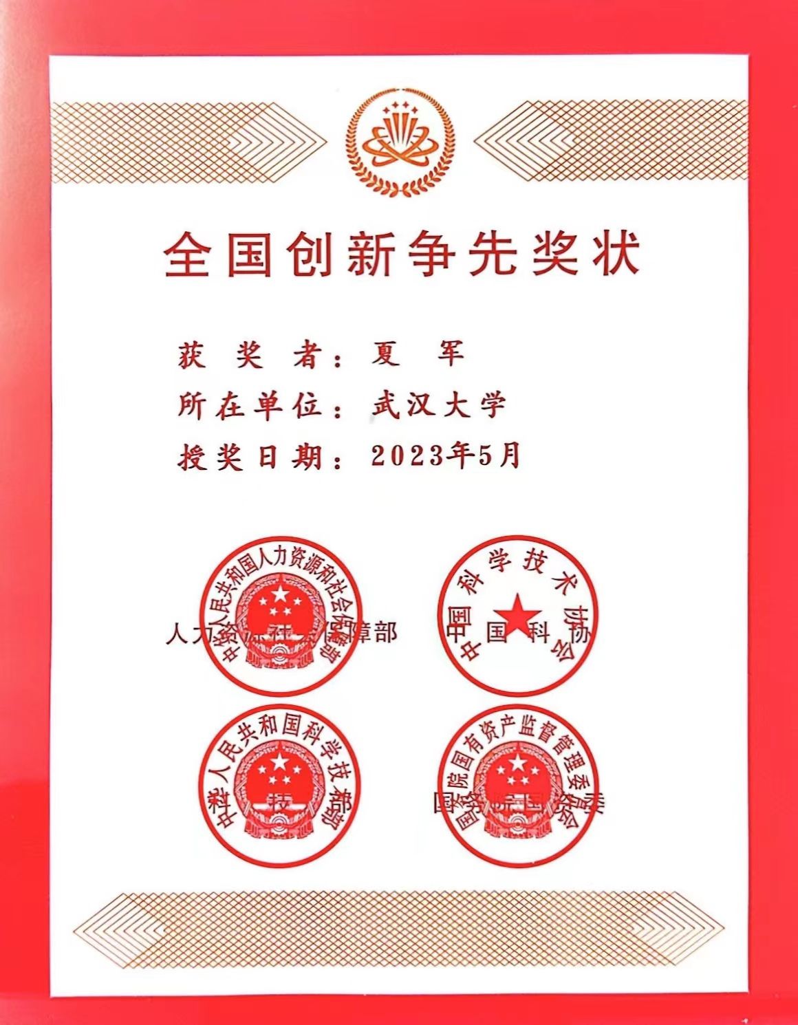 夏军院士荣获第三届“全国创新争先奖状”。