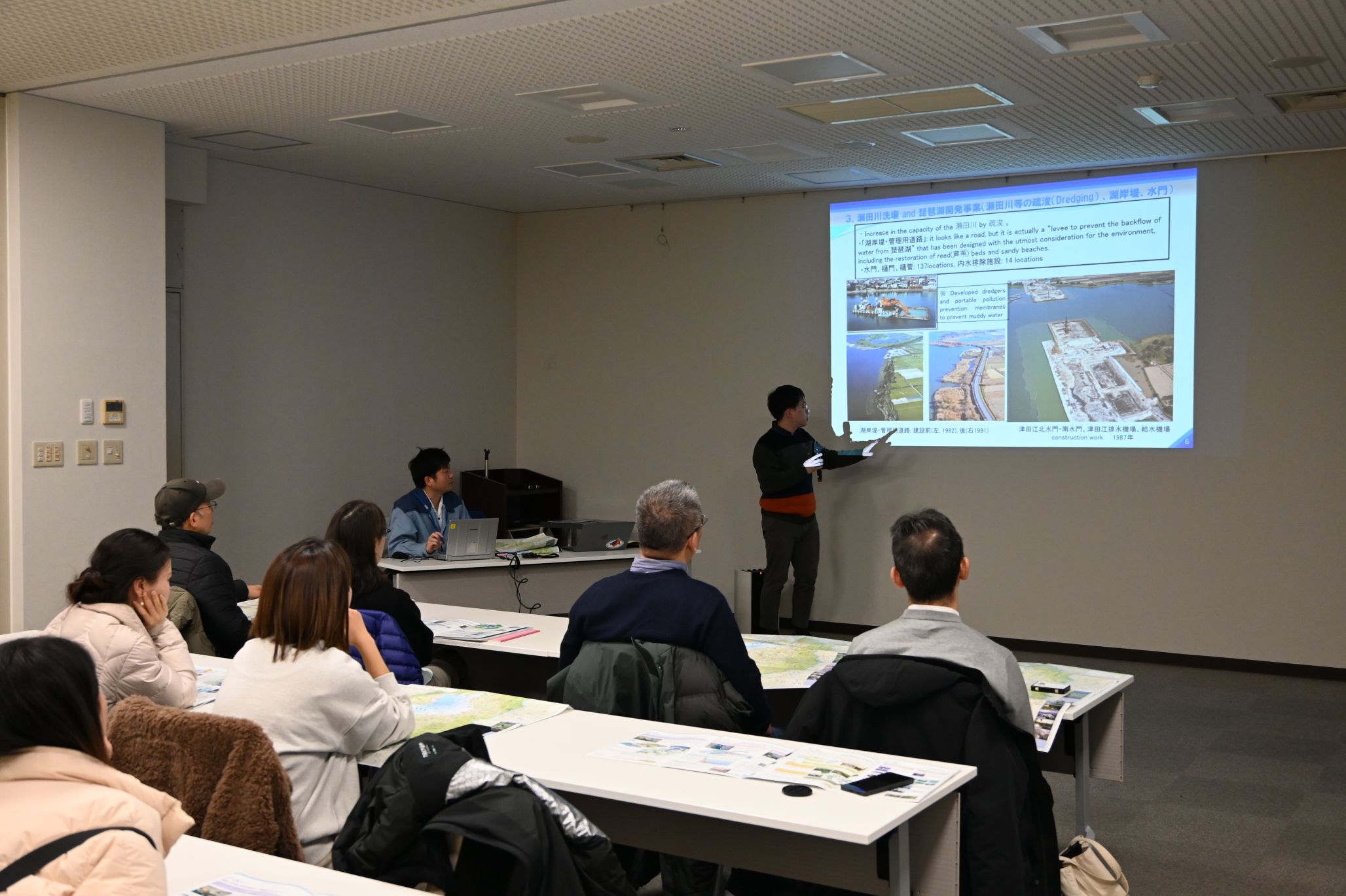1月23日上午,实践队前往琵琶湖开发综合管理所,听取了所内领导及工作人员关于琵琶湖治理的报告。前期实践队成员已了解了琵琶湖在防洪方面的举措,今天进一步学习了琵琶湖水资源管理方面的相关措施。工作人员从“治水”、“利水”、“环境”三个主题进行讲解,让实践队员感受到只有在技术手段、规划制度和公众参与等方面形成合力,才能有效应对水资源管理中的复杂问题。此外,在介绍琵琶湖水资源调度时,张小峰老师带领同学们进行了一个简单的计算,每年大致12亿m³的琵琶湖蓄水需要供给日本关西地区,这占琵琶湖总蓄水量的20%左右,在干旱情况下,保障供水是极具挑战的。