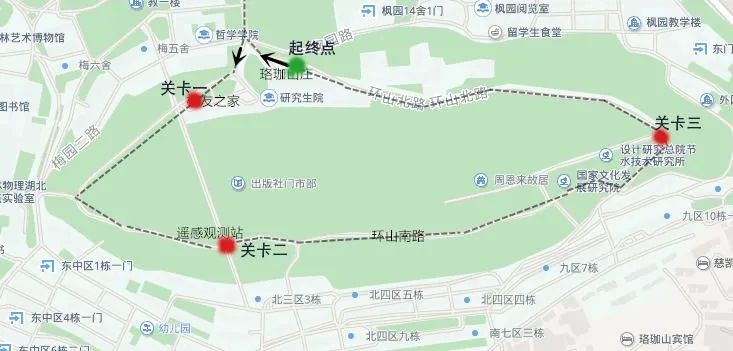 珞珈山庄--→枫园路与环山路交叉路口直行--→校友之家--→遥感国家野外科学观测研究站--→环山南路路段--→珞珈山庄(环珞珈山一周)