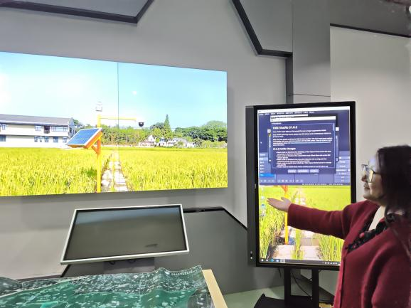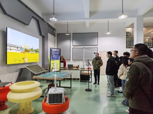 在水利、遥感等领域的技术优势,积极探索低碳农业背景下人工智能技术的应用场景,研发出的“珈禾助手”水稻智能管理APP的研发过程及应用成果。本科生党支部的同学们还现场体验了“珈禾助手”AR技术的应用过程,通过平面沙盘,查看示范灌区3D动态实景模型,以及气象、土壤、作物等相关指标数据的实时变化情况。