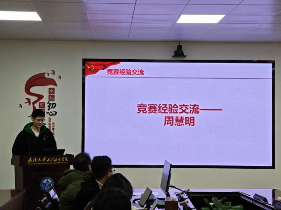 最后,周慧明同志分享了自己参加相关竞赛的心得体会,通过参加科研竞赛可以培养自己的创新能力和解决实际问题的能力,培养团队意识、合作意识,为今后的研究生生活奠定一定的基础。