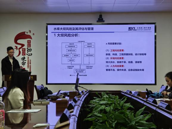 科研交流环节,首先由水利工程系研究生第四党支部蔡闻达同志做主题为“大坝风险防控及有限元分析”的汇报,主要内容有大坝风险防控及管理、有限元分析方法、随机场及空间变异性等相关内容,向大家介绍了目前的研究现状及主要研究流程,并做简单的案例分析。
