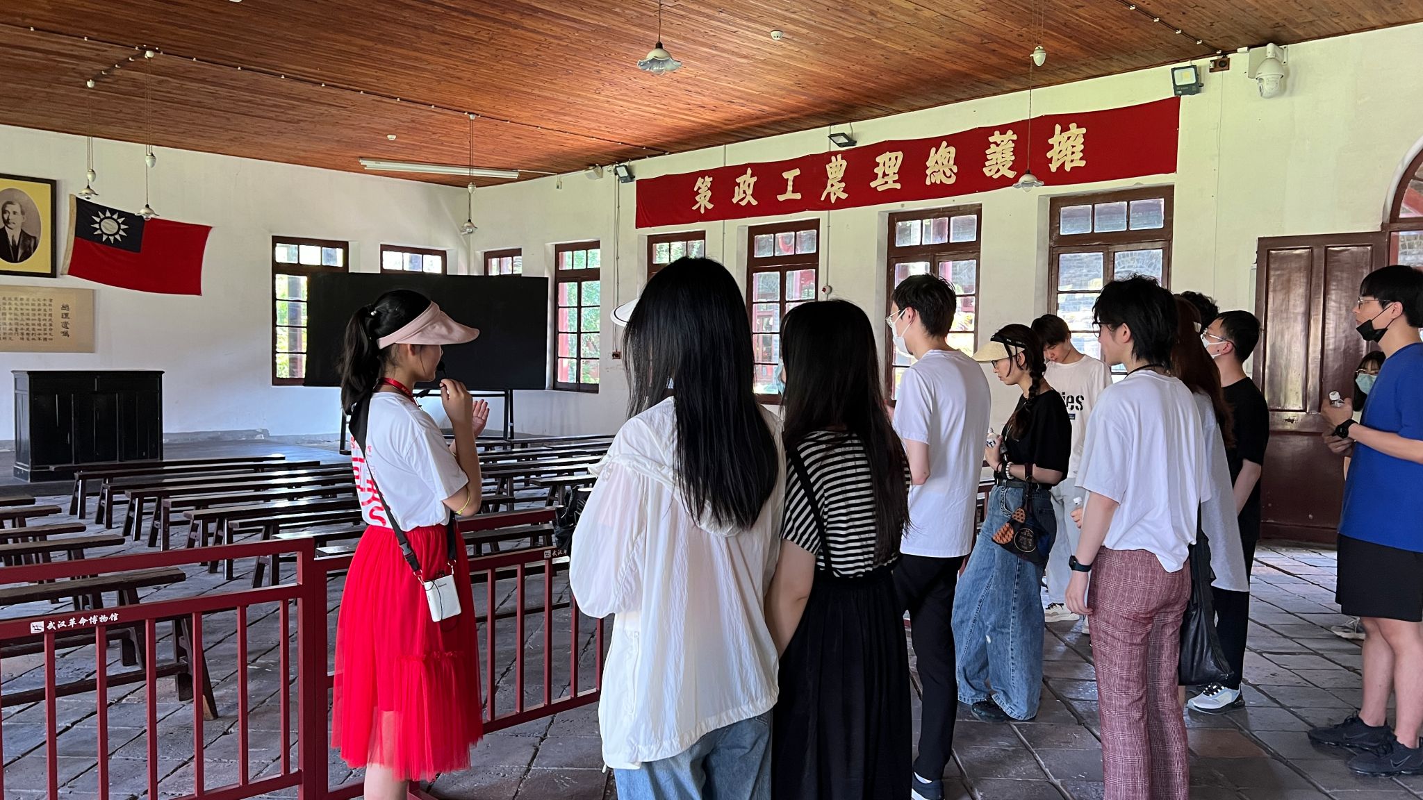 进入纪念馆,赫然映入眼帘的是中共五大开幕式复原后的现场场景:主席台上方张贴着马克思、孙中山和列宁领袖像,墙上张贴着“中国革命成功万岁”的标语。