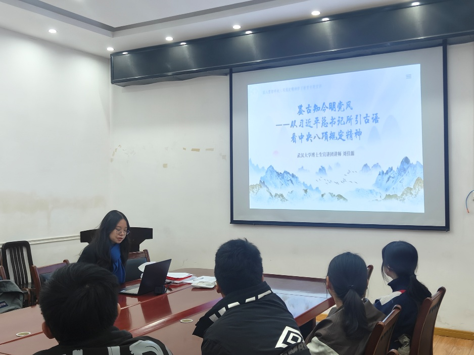 博士生宣讲团讲师刘佳源同志带领支部全体成员深入学习《鉴古知今明党风——从习近平总书记所引古语看中央八项规定精神》。刘佳源同志首先系统阐述了中共中央八项规定及其精神的深刻内涵与时代意义,指出这是全面从严治党的重要抓手,体现了党自我革命的坚定决心。随后,引经据典,通过三句经典古语展开深入解读:以"没有规矩,不成方圆"阐释八项规定作为党内铁规的重要作用,强调全体党员必须严守纪律底线;以"俭则约,约则百善俱兴"剖析勤俭节约的深远意义,指出这既是优良传统,更是净化政治生态的关键;以"尽小者大,慎微者著"强调作风建设要从小事着手,在细微处见真章,做到防微杜渐。刘佳源同志将传统文化智慧与中共中央八项规定精神相融合,内容翔实,说理透彻。通过这次学习,支部成员进一步强化了纪律观念、节俭意识和细节意识,将在今后的工作学习中自觉对标对表,严格要求自己,以实际行动持续巩固拓展作风建设成效,永葆共产党员的先进性与纯洁性。