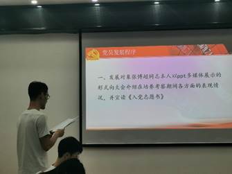 会议第二项议程,讨论张博超同志的发展问题。首先,全体起立奏唱国歌,组织委员张宇婷同志清点到会正式党员,本次到会正式党员人数符合开会要求。然后,张博超同志上台以PPT的形式从自身基本情况、入党发展历程、自身优缺点、未来努力方向等方面对培养考察期间的表现进行了自我评价,并宣读《入党志愿书》。张博超同志的两位入党介绍人介绍了发展对象的基本情况,并一致表示赞同其加入中国共产党,组织委员张宇婷同志随后宣读了支部委员会对发展对象的综合意见。在素质测试环节,张博超同志围绕当前时政热点话题,针对美日澳印近期举行的四方会谈表达了自己深入而独到的见解。接下来,到会成员对张博超同志的入党问题发表意见。之后经正式党员不记名投票,赞成人数超过应到会有表决权的正式党员的半数,通过张博超同志的入党决议。支部书记赵学银同志宣读了《关于接收Porncams
