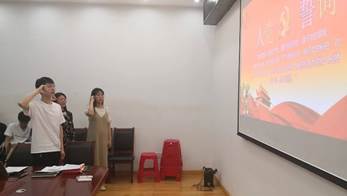 水利系研究生第五党支部预备党员胡旭铧同志如期转为中共正式党员的决议(草案1)》,并在赵学银同志带领下,向梦同志和胡旭铧同志面向党旗宣读入党誓词。会议流程规范,希望向梦同志和胡旭铧同志在今后的工作生活中发挥党员的模范带头作用。