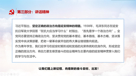 首先,蒋睿菁同志带领大家学习习近平总书记在瞻仰延安革命纪念地时重要讲话精神。从讲话背景、讲话内容等方面全面介绍习近平总书记在延安的这次讲话。“不忘初心、站稳立场、继续奋斗”是本次讲话的主要内容与精神导向。要继承和发扬延安时期党形成的优良革命传统和作风,自觉把以人民为中心的发展思想贯穿到各项工作之中,形成坚定正确的政治方向,将自力更生,艰苦奋斗的创业精神为主要内容的延安精神贯穿入学习与生活中。踏上新征程,向着新的奋斗目标勇毅前行。