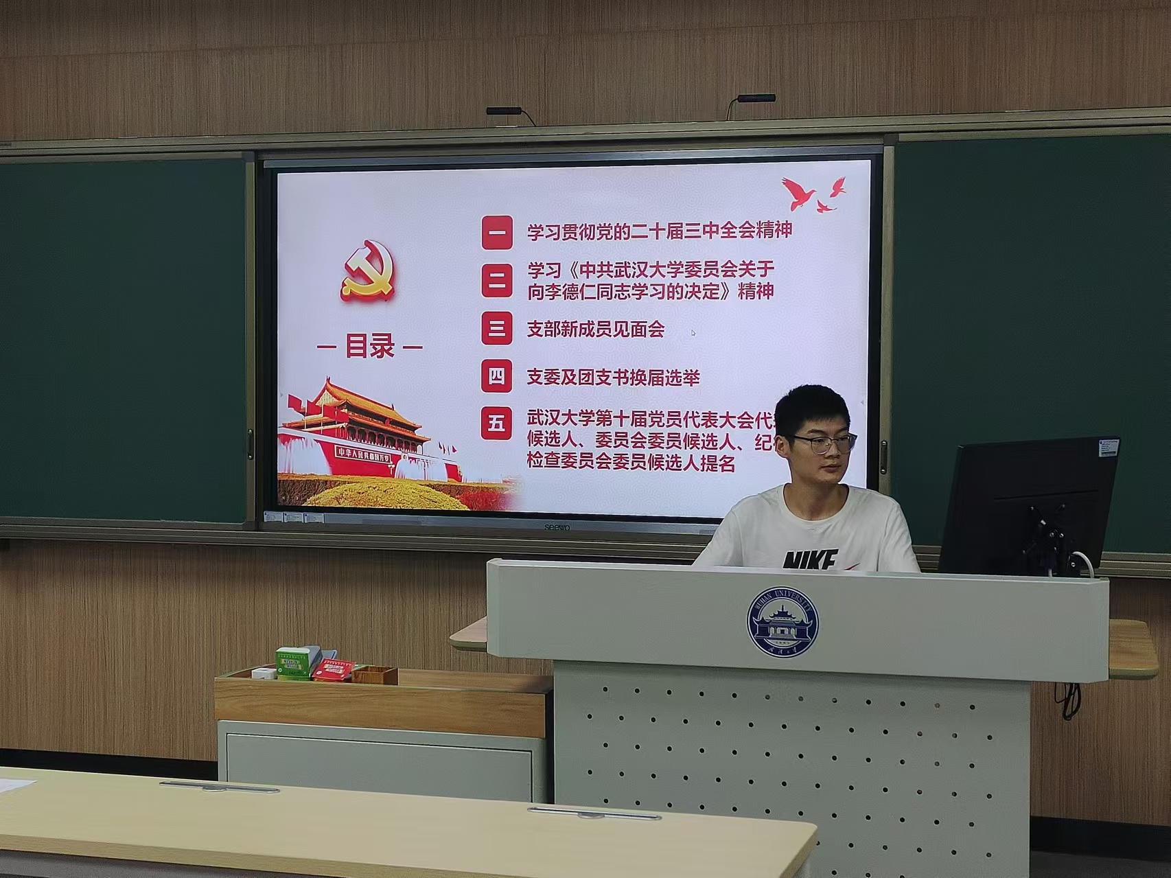 委员会关于向李德仁同志学习的决定》精神、支部新成员见面会、支委换届选举以及相关候选人提名。