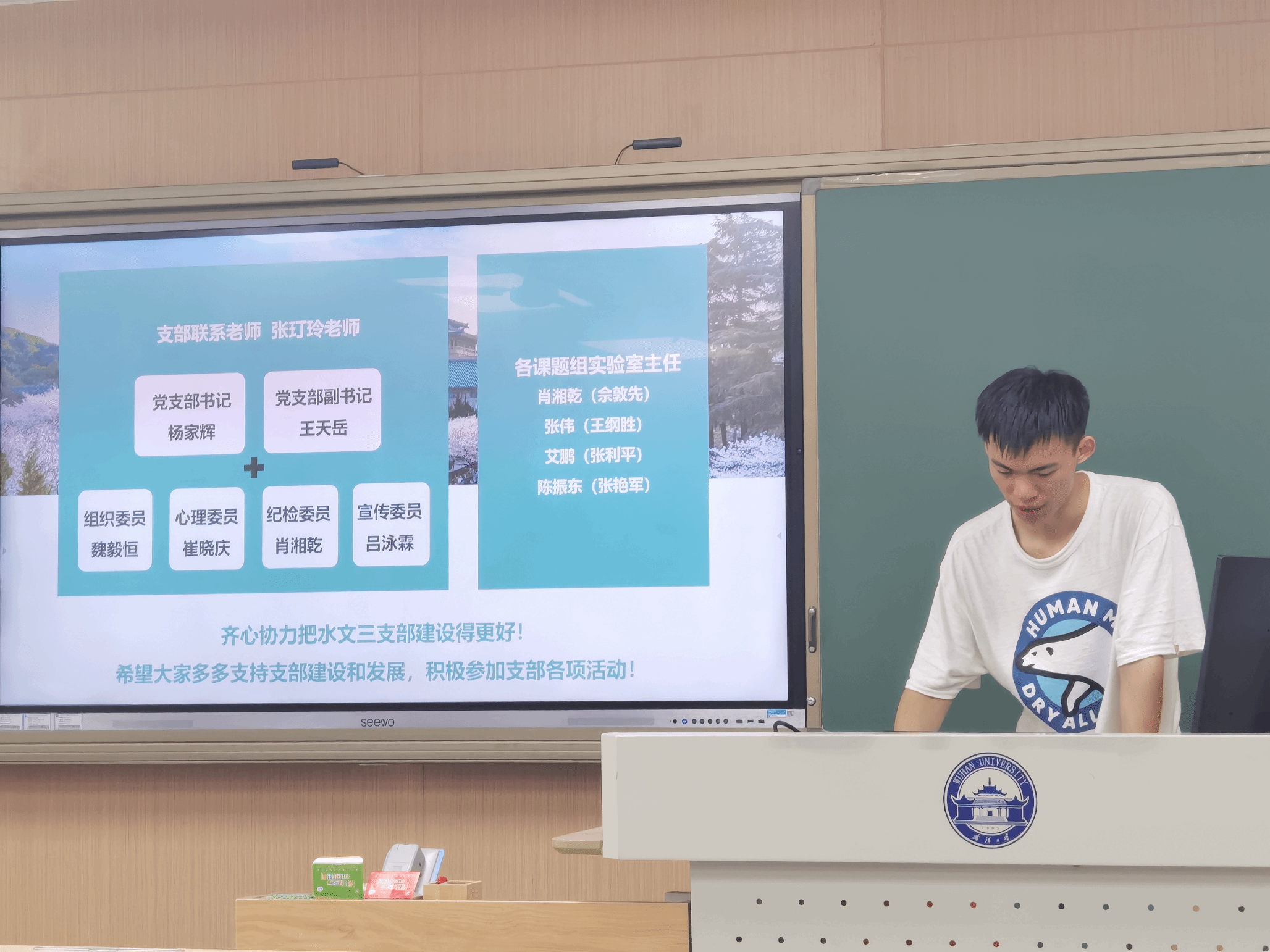 本次会议的第三部分为支部换届大会。会议上,杨家辉同志对过去一年的工作进行了总结,感谢每一位支部成员的辛勤付出,并介绍了新一届支部成员的候选人。通过举手表决的方式,全体成员一致通过了新一届支部委员的产生,确保党支部的有序交接。新当选的支部委员表示将继续发扬团队合作精神,落实各项工作计划,并在新的学期里积极开展党组织活动,增强支部的凝聚力和战斗力。他们将关注广大同学的思想动态,积极开展学习交流活动,提高党员的整体素质,为水文水资源系的发展贡献力量。
