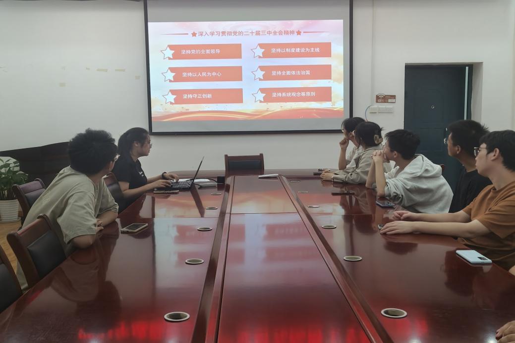 本次会议首先由张雪梅同志带领全体支部成员深入学习党的二十届三中全会精神,她以全面深化改革的总目标引入,阐释了坚持党的全面领导、坚持一制度建设为主线、坚持以人民为中心、坚持全面依法治国、坚持守正创新和坚持系统观念等原则六方面内容。支部成员们在会中展开热烈讨论,学习氛围浓厚的同时更加坚定了理想信念。