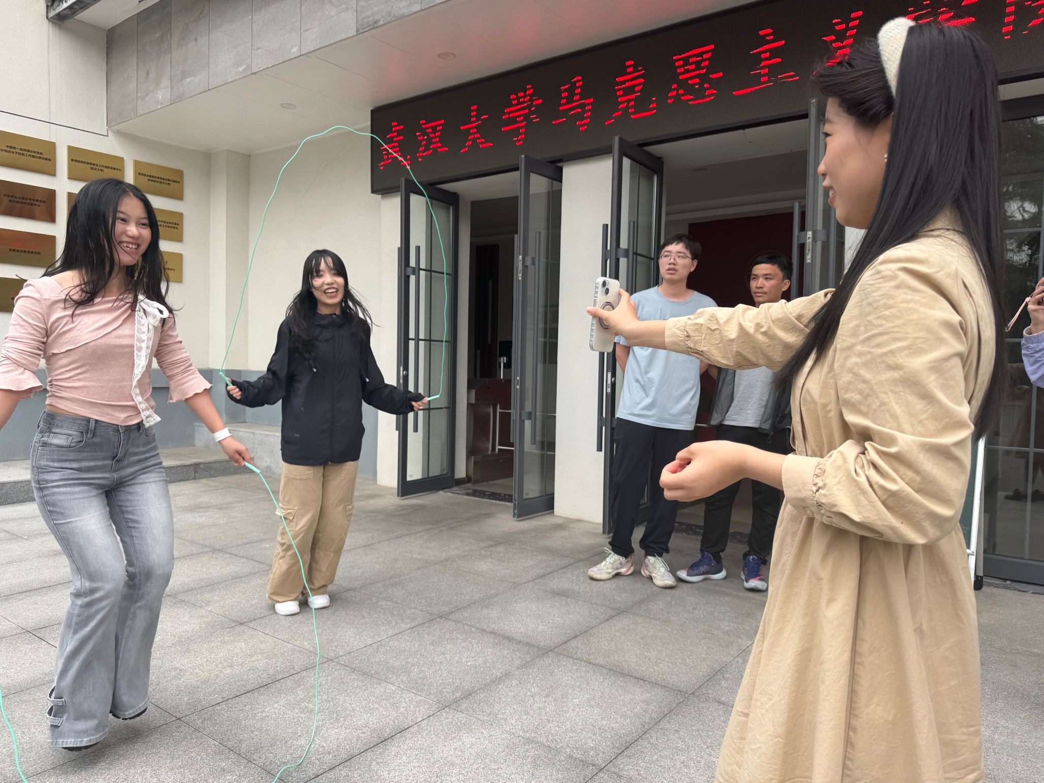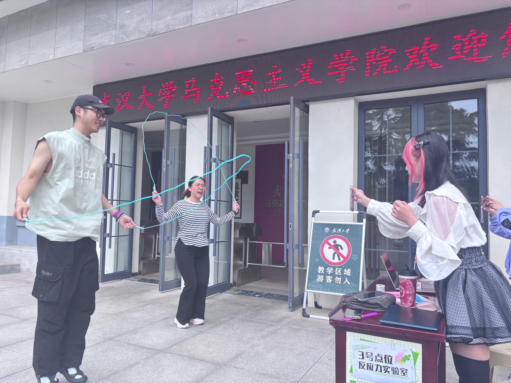 第三站是设在马克思主义学院门口的“反应力实验室”,团队成员需连续跳绳30次并准确读出展示的数字。既锻炼了大家的反应能力,又增强了团队协作意识。