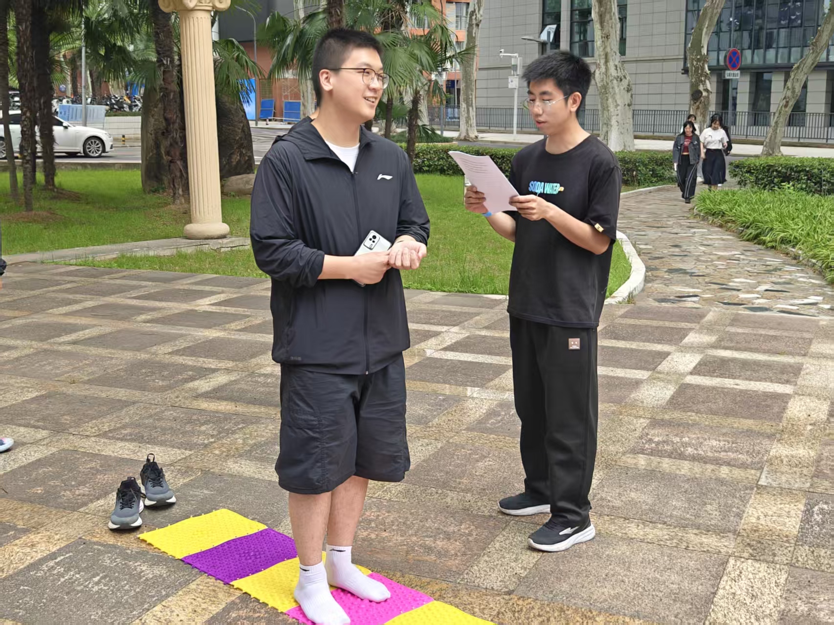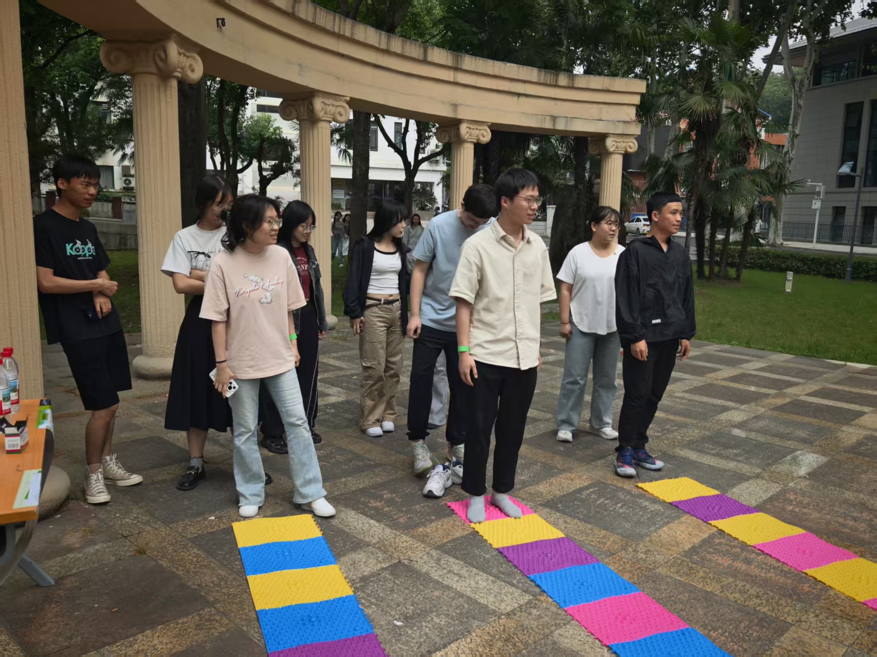 正式拉开帷幕。随着一声令下,十组同学们踏上了这场身心修行的旅程。本次活动精心设计了四大趣味打卡点,第一站是位于世纪广场的“指压板答题”,团队成员需赤脚完成5米指压板行走,并回答心理小常识问题。此环节不仅考验了参与者的身体耐受力,更在答题过程中普及了心理健康知识。