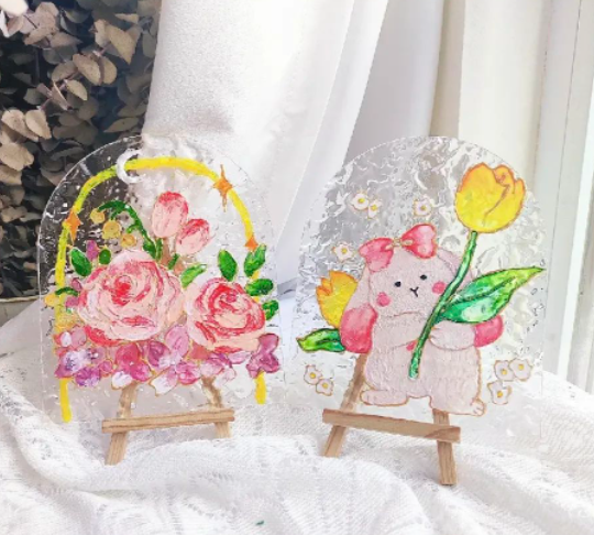 选好心仪的图案垫在玻璃灯板下,用颜料勾勒出图案的形状并填色,等待颜料固化,将玻璃灯板插上电源,就收获了流光彩溢的氛围灯一枚~