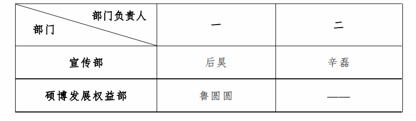 注:表中各部门负责人共同负责部门工作,名字顺序不分主次。