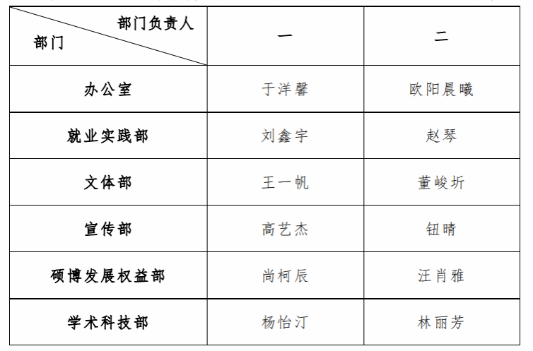 1、研究生会部门负责人及工作人员任职公示如下: