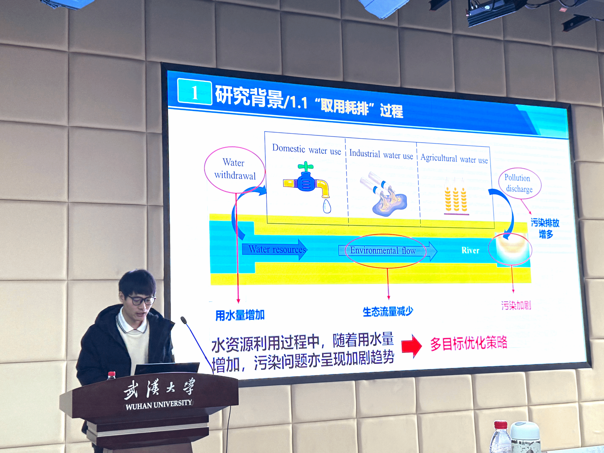 最后,范志鹏同学以《水资源使用与污染冲突管理中的谈判成本与博弈研究》为题进行学术报告。由于水资源使用过程中,随着用水量增加,污染问题亦呈现加剧趋势,因此协调水资源使用与环境保护之间的矛盾成为当务之急。范志鹏同学首先介绍了多目标优化及博弈,并引出加权和法、目标规划法等求解方法。随后,他提出建立汉江中下游流域用水与排污的多目标优化模型,并引入贴现因子以反映讨价还价博弈过程的协商成本。最后,他结合折衷规划提出CIMB-CP模型不仅预测了不同情景中的潜在影响,还识别了达成共识的最优路径,为解决水资源使用与污染排放之间的冲突提供了参考思路。